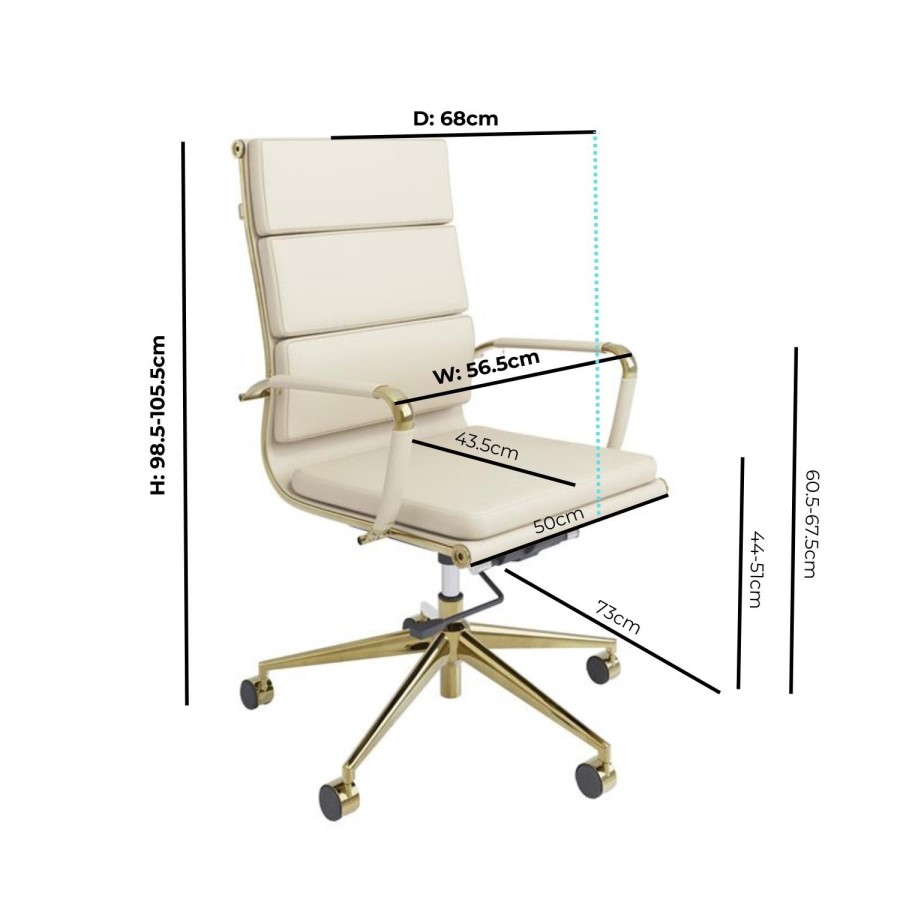 Bring modern style and everyday comfort to your workspace with the Benson Swivel Office Chair with High Backrest. Upholstered in premium faux leather with a neutral beige finish and complemented by a sleek gold leg frame and armrests, it adds sophistication to any room. The tall backrest, ergonomic design and generous foam padding provide excellent support and promote good posture, while the padded armrests enhance all-day comfort. With adjustable height, tilt mechanism, castor wheels, and a smooth 360° swivel, it offers flexible movement and adaptable comfort whether you’re working or unwinding.