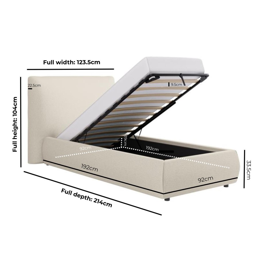 Add a touch of luxury to any bedroom with Dune ottoman bed. Crafted with comfort in mind, the sumptuously cushioned pillow headboard creates a plush and comfortable sleeping experience for those who value both style and comfort. Its neutral beige colour complements any bedroom decor. The bed has a space-saving ottoman base perfect for linens, towels or seasonal clothing storage. The end-opening gas-lift mechanism allows you to access the generous storage space easily. It's sprung-slatted for ultimate comfort and fits a UK standard single-size mattress.