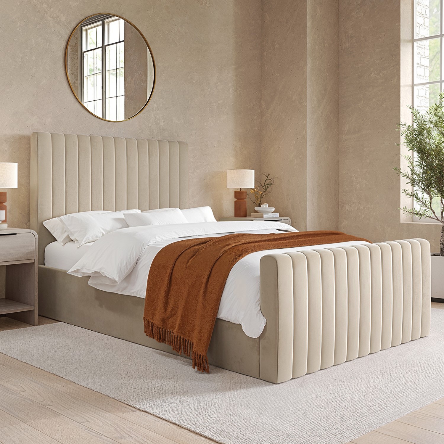 The Khloe Ottoman Bed is an opulent focal point for any bedroom, perfect for adding a touch of luxury while offering practical hidden storage. Upholstered in luxuriously soft beige velvet fabric, it fits seamlessly into any modern bedroom design. The side-opening gas-lift mechanism allows you to access the generous fabric-lined storage space effortlessly. You can also set the storage frame to open on either the right or left-hand side, allowing extra freedom with your bedroom layout. It features a sprung slatted base for comfortable mattress support, ensuring a great night's sleep. This bed fits a UK standard double-size mattress, which is not included, giving you the freedom to pair it with a mattress of your choice.