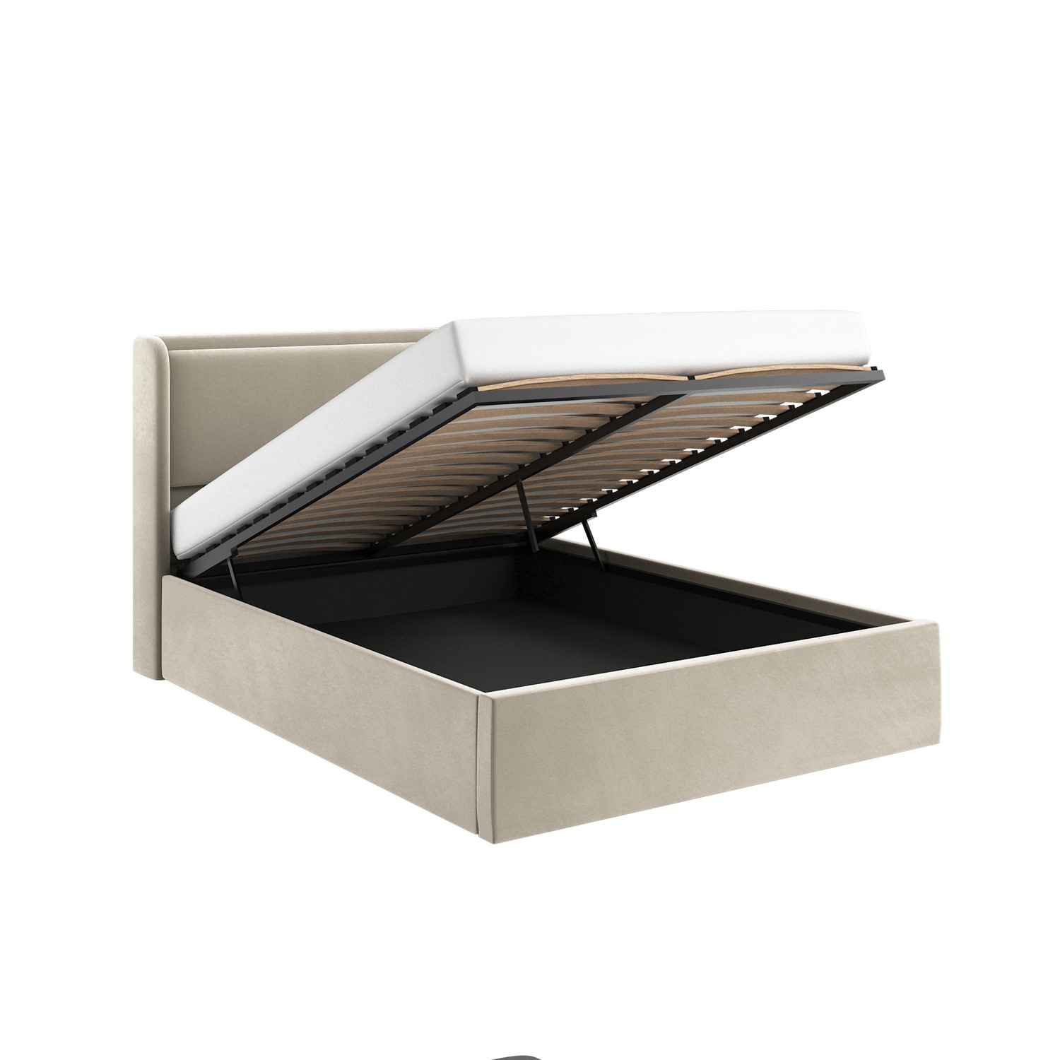 The Frida Ottoman Bed blends modern functionality with timeless style. Upholstered in a neutral beige velvet, its plush, pillow-style winged headboard creates a luxurious focal point that invites relaxation, making it the perfect statement piece for any bedroom. The clean lines and gently rounded edges give it a minimalist aesthetic. Designed with spacious storage, the bed has an end-opening gas-lift mechanism for easy access to a spacious, fabric-lined storage compartment. The sprung slatted base provides enhanced mattress support and ventilation. This bed fits a UK standard king-size mattress.