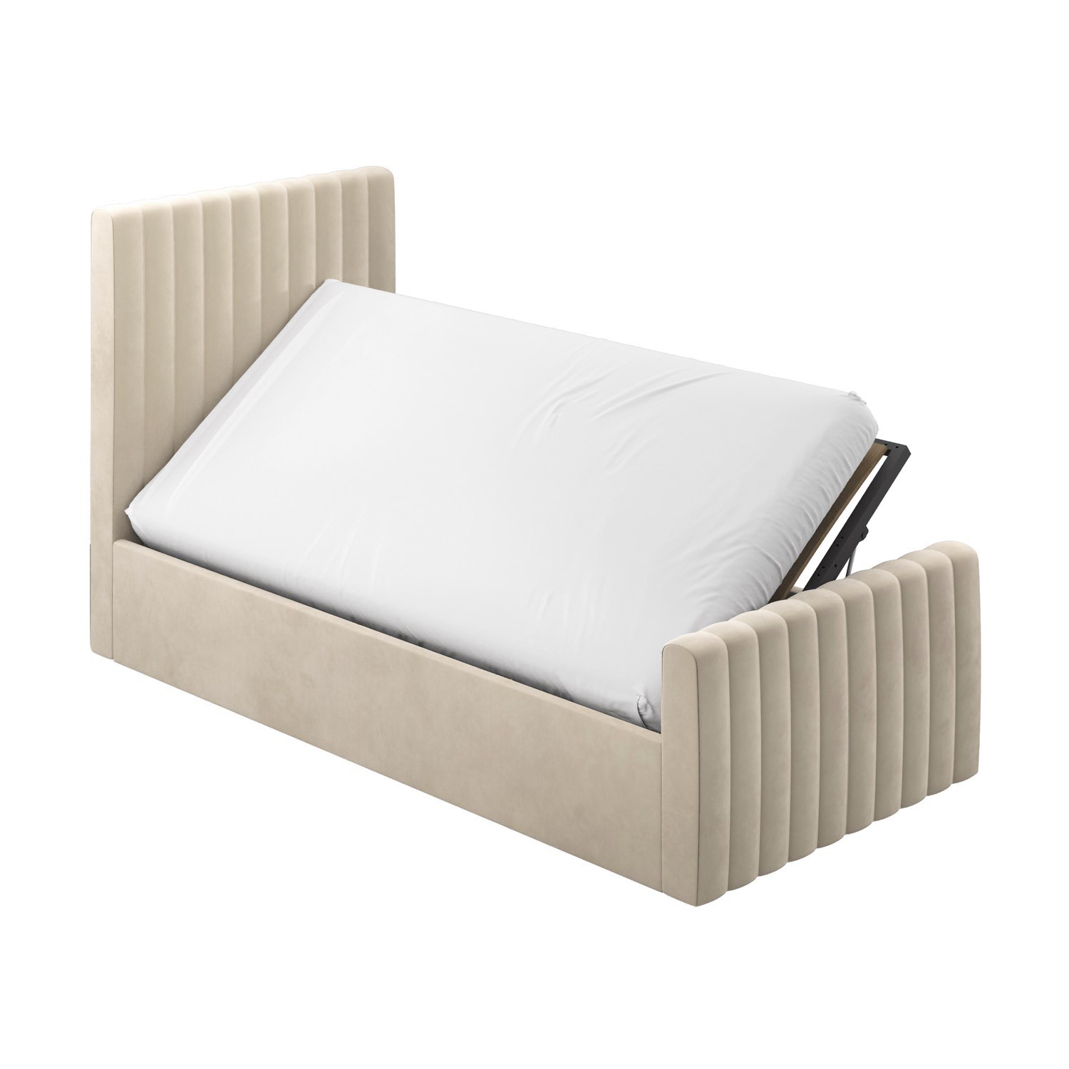 The Khloe Ottoman Bed is an opulent focal point for any bedroom, perfect for adding a touch of luxury while offering practical hidden storage. Upholstered in luxuriously soft beige velvet fabric, it fits seamlessly into any modern bedroom design. The side-opening gas-lift mechanism allows you to access the generous fabric-lined storage space effortlessly. You can also set the storage frame to open on either the right or left-hand side, allowing extra freedom with your bedroom layout. It features a sprung slatted base for comfortable mattress support, ensuring a great night's sleep. This bed fits a UK standard single-size mattress, which is not included, giving you the freedom to pair it with a mattress of your choice.