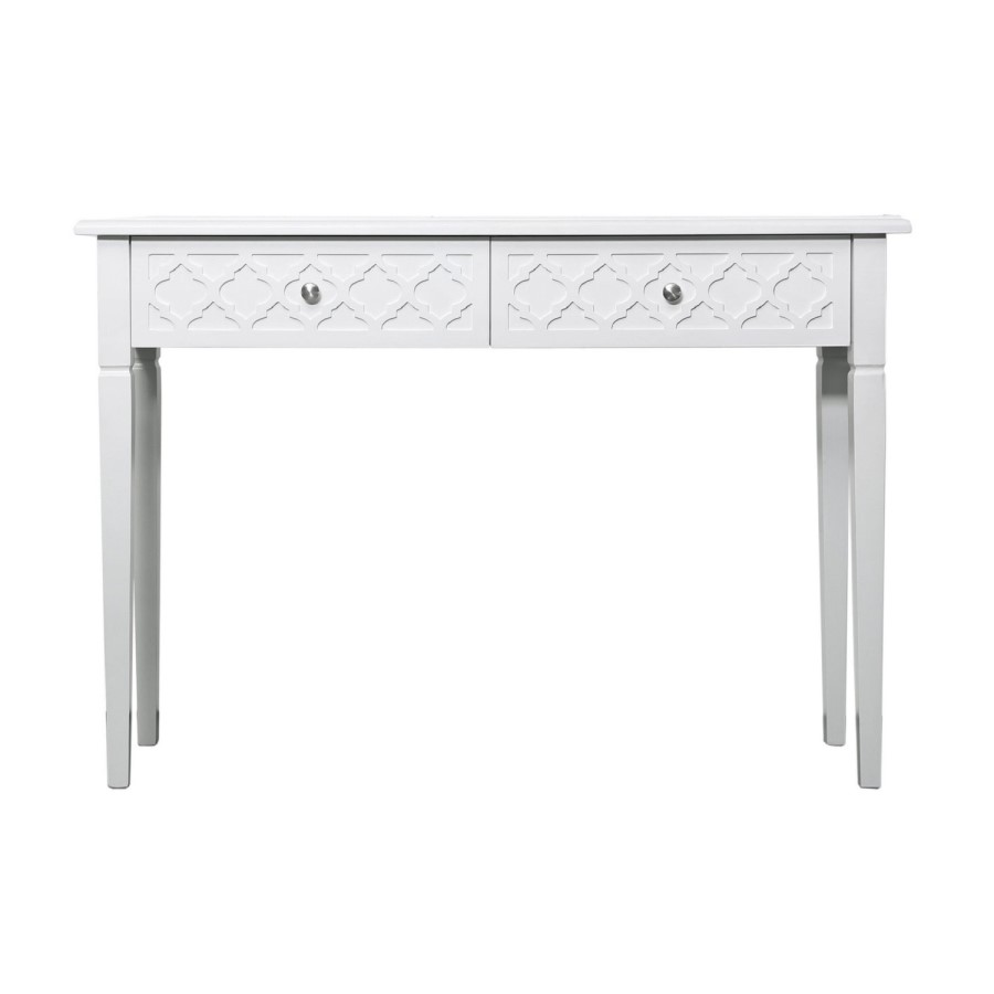 Taking influence from the vibrant cities of Morrocco the Bella console table will add interest to any entry/hallway, featuring 2 drawers with metal drawer knobs and a raised quatrefoil design with a mirrored tabletop.