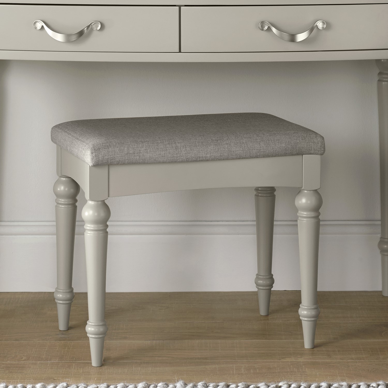 Invite some glamour into the bedroom with the Montreux collection. Equally suited to modern as well as traditional settings, the dressing table stool boasts a comfortable pebble grey fabric seat pad with an on-trend urban grey painted frame. Matching dressing table sold separately.