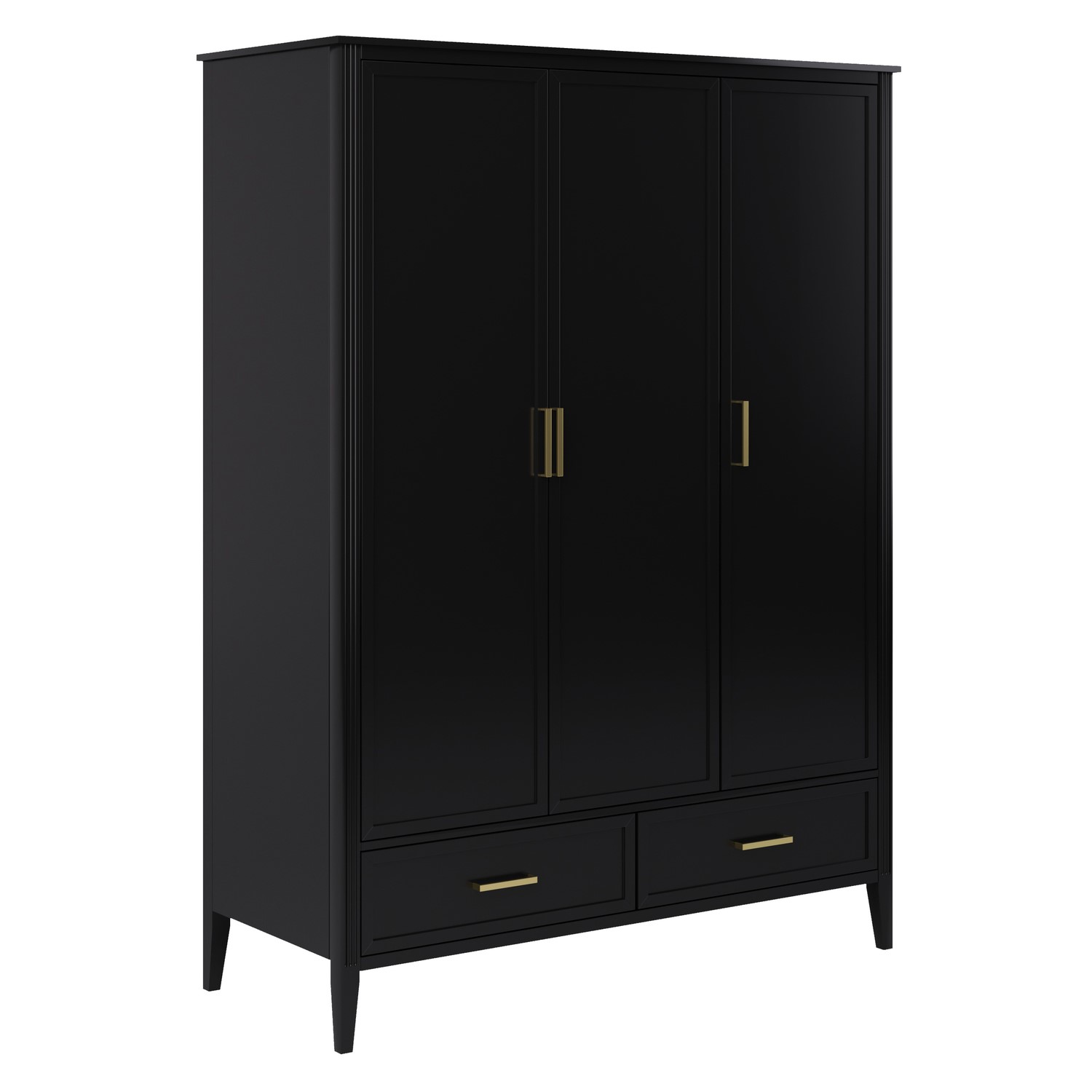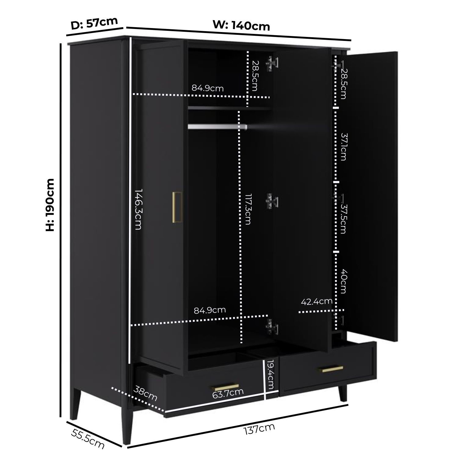 The Delilah Black 3 Door Wardrobe is a beautifully crafted storage solution, designed to bring timeless elegance and practical functionality to your bedroom. With three full-height doors and two large drawers, it offers a generous mix of hanging and folded storage, helping you keep everything from coats to knitwear in perfect order.