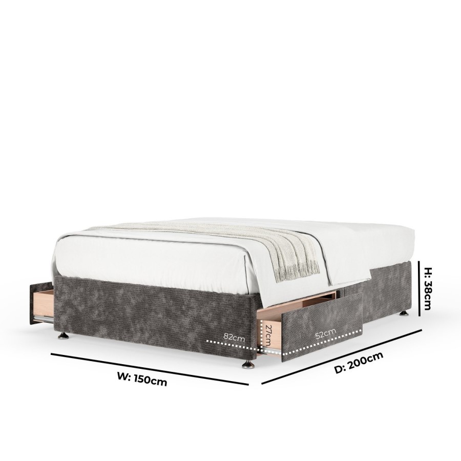 Bring effortless elegance, smart storage, and reliable support to your bedroom with the Maddison Divan Bed Base with 2 Drawers. Upholstered in a soft, durable black chenille fabric and finished with sleek chrome details, it blends timeless style with practical function. The two spacious drawers can be positioned either on one side or one on each side, offering discreet storage while keeping your essentials close at hand. The solid platform top keeps your mattress secure, while its universal build ensures compatibility with any headboard. Expertly crafted by one of the UK’s leading manufacturers, it offers lasting strength, quality, and durability. This divan bed base is made to order to suit your needs and is also simple to assemble—it’s just a matter of fixing the feet and attaching your chosen headboard. It fits a UK standard king-size mattress, which is not included, giving you the freedom to pair it with a mattress of your choice.