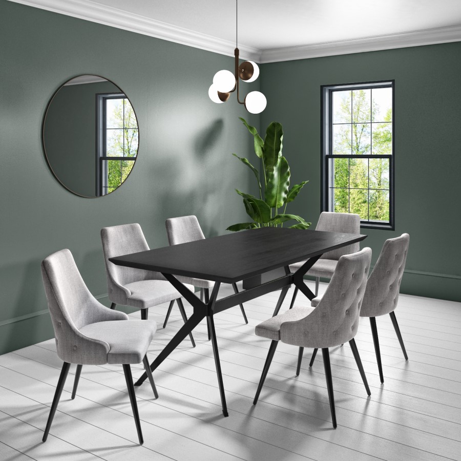 - Black dining table with blackened oak-effect table top