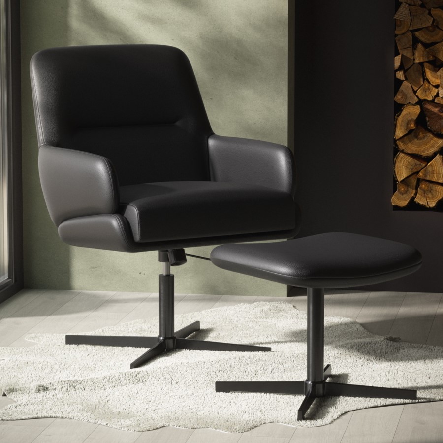 Indulge in this comfy modern recliner accent chair and footstool duo. With plush foam padding and soft faux leather upholstery, you’re assured of a snug sit when you put your feet up to relax after a long day. The tilt mechanism allows for effortless reclining that locks into place, plus it features a full 360° swivel and its height adjustable. This accent chair and footstool set gives you complete freedom.