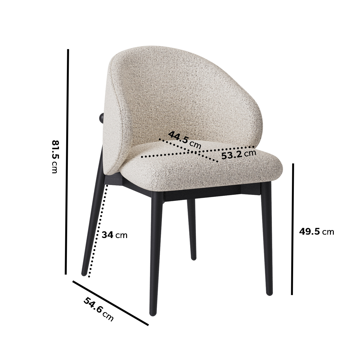 The sculptural Oscar table, with its smooth pebble-like shape and bold pillar legs, anchors the room with contemporary elegance. Its rich black oak veneer adds depth and texture, making it centrepiece in your dining room. Complementing the table are six Kori chairs, upholstered in two tone cream and black textured fabric. Their curved backs and foam-filled seats offer lasting comfort, while the exposed black painted wood back detail brings warmth and contrast to the set. Together, they strike the perfect balance between bold design and inviting detail – effortlessly elevating your everyday dining experience.