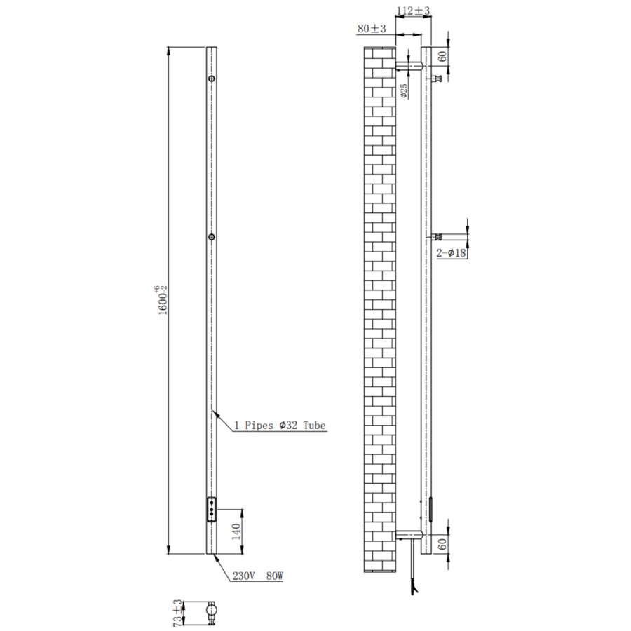 - Radiator Dimensions: H1600 x W73 x D112mm