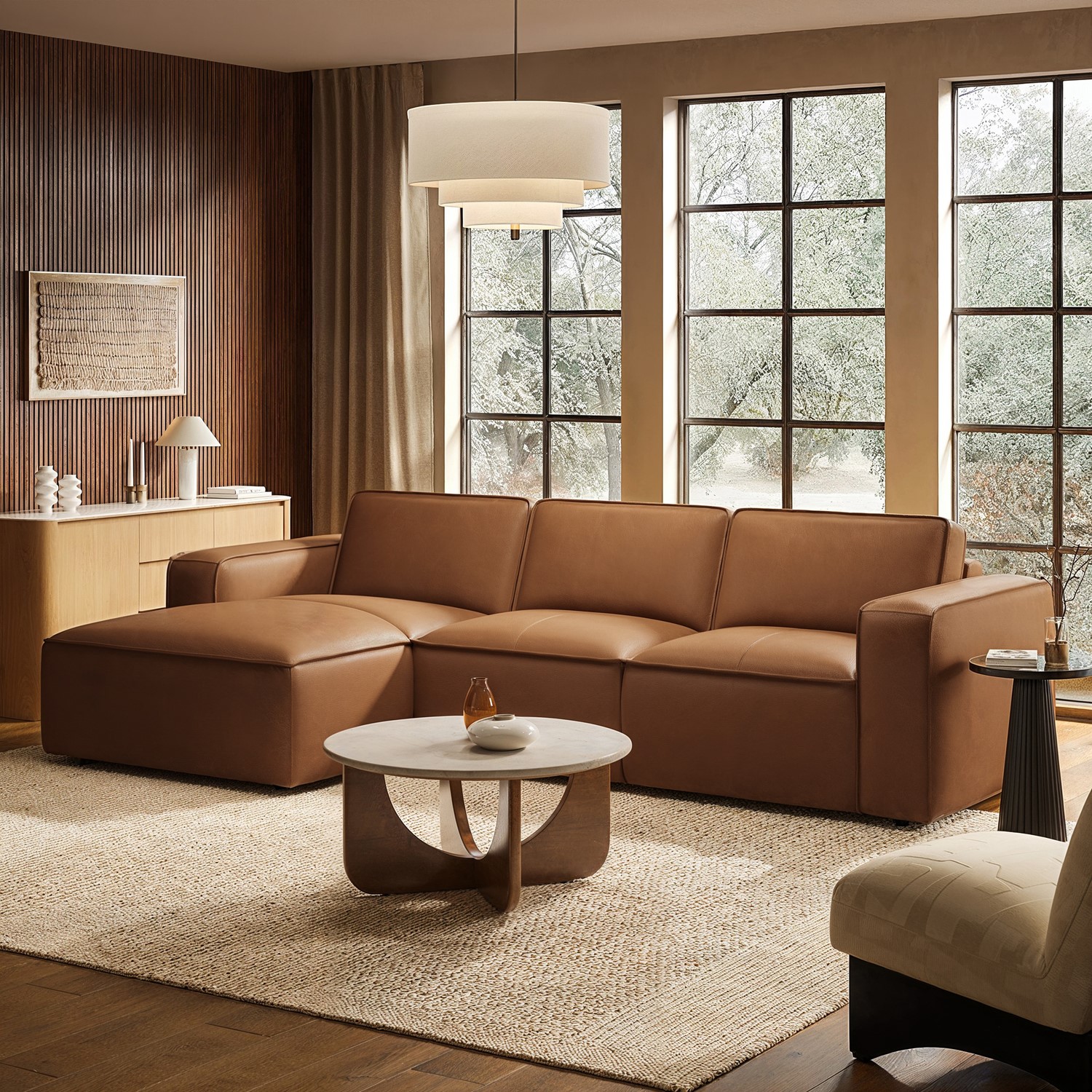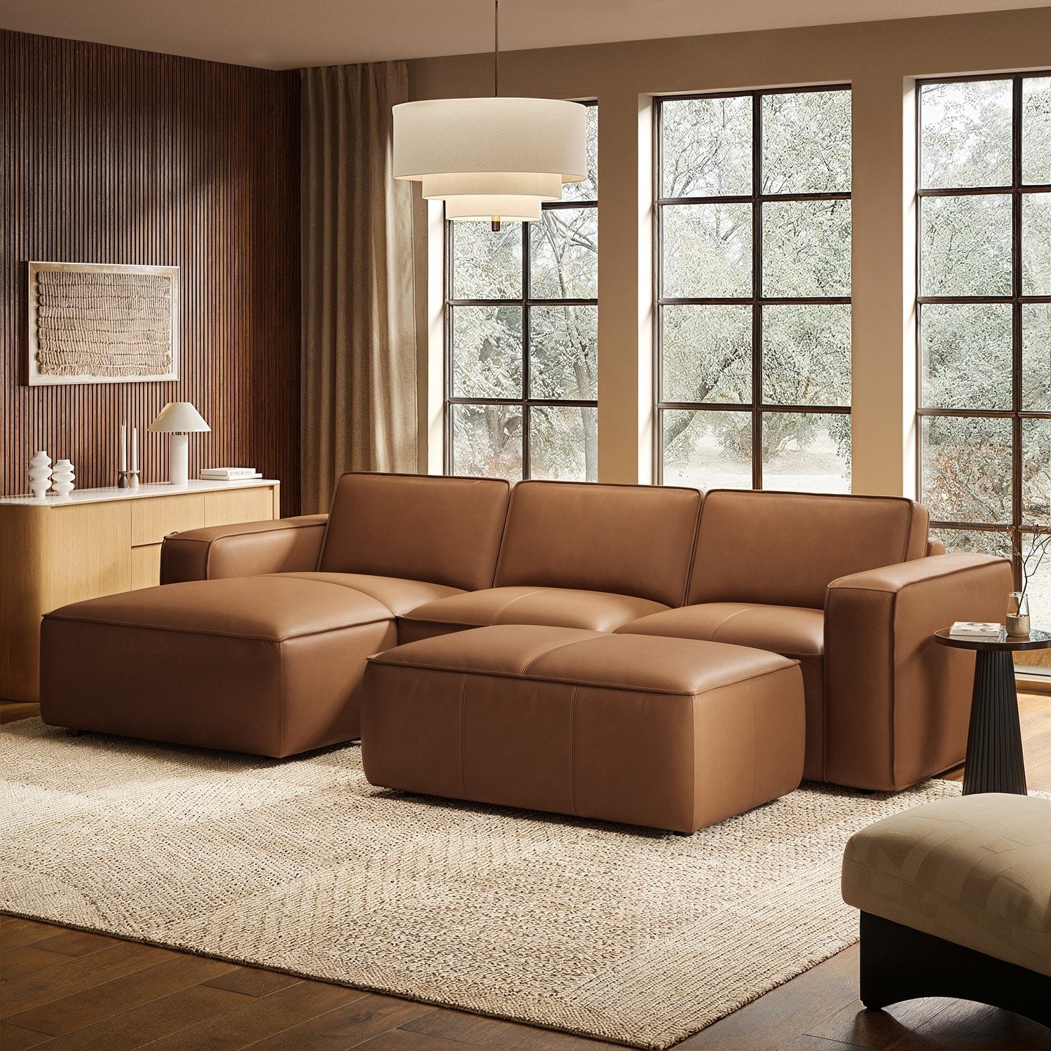 Elevate your living space with the Samuel Left-Hand Chaise Sofa, where premium craftsmanship meets modern design. Upholstered in genuine tan brown leather, its clean silhouette is complemented by wide, square arms, sleek lines, and thoughtful details like clean stitching, refined piping, and pleated accents. Designed to seat four people comfortably, it offers generous space for lounging, making it a stylish and inviting centrepiece for any contemporary interior.
