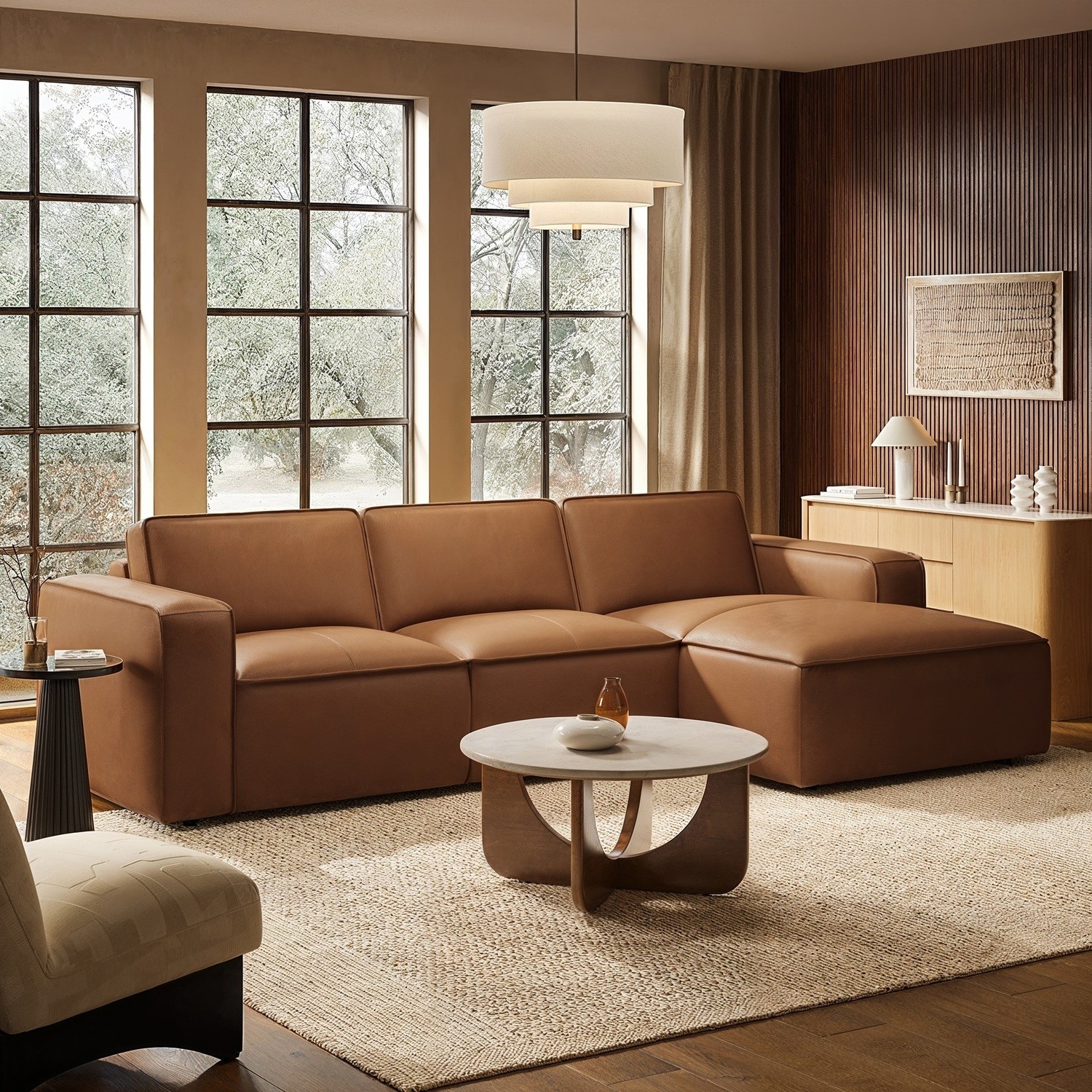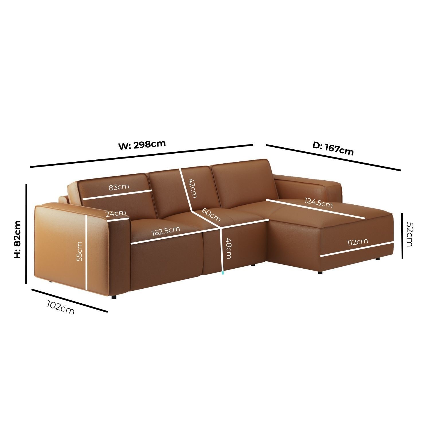 Elevate your living space with the Samuel Right-Hand Chaise Sofa, where premium craftsmanship meets modern design. Upholstered in genuine tan brown leather, its clean silhouette is complemented by wide, square arms, sleek lines, and thoughtful details like clean stitching, refined piping, and pleated accents. Designed to seat four people comfortably, it offers generous space for lounging, making it a stylish and inviting centrepiece for any contemporary interior.