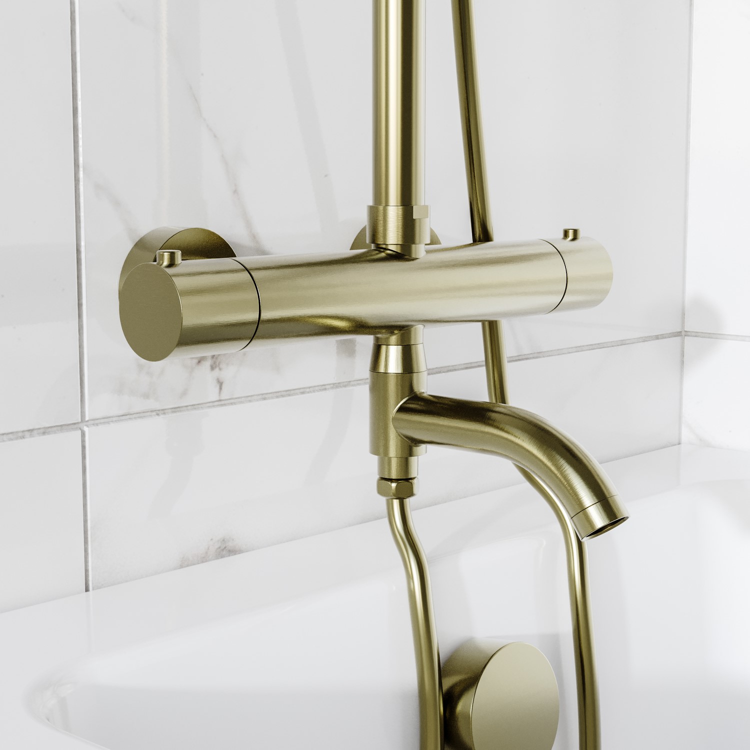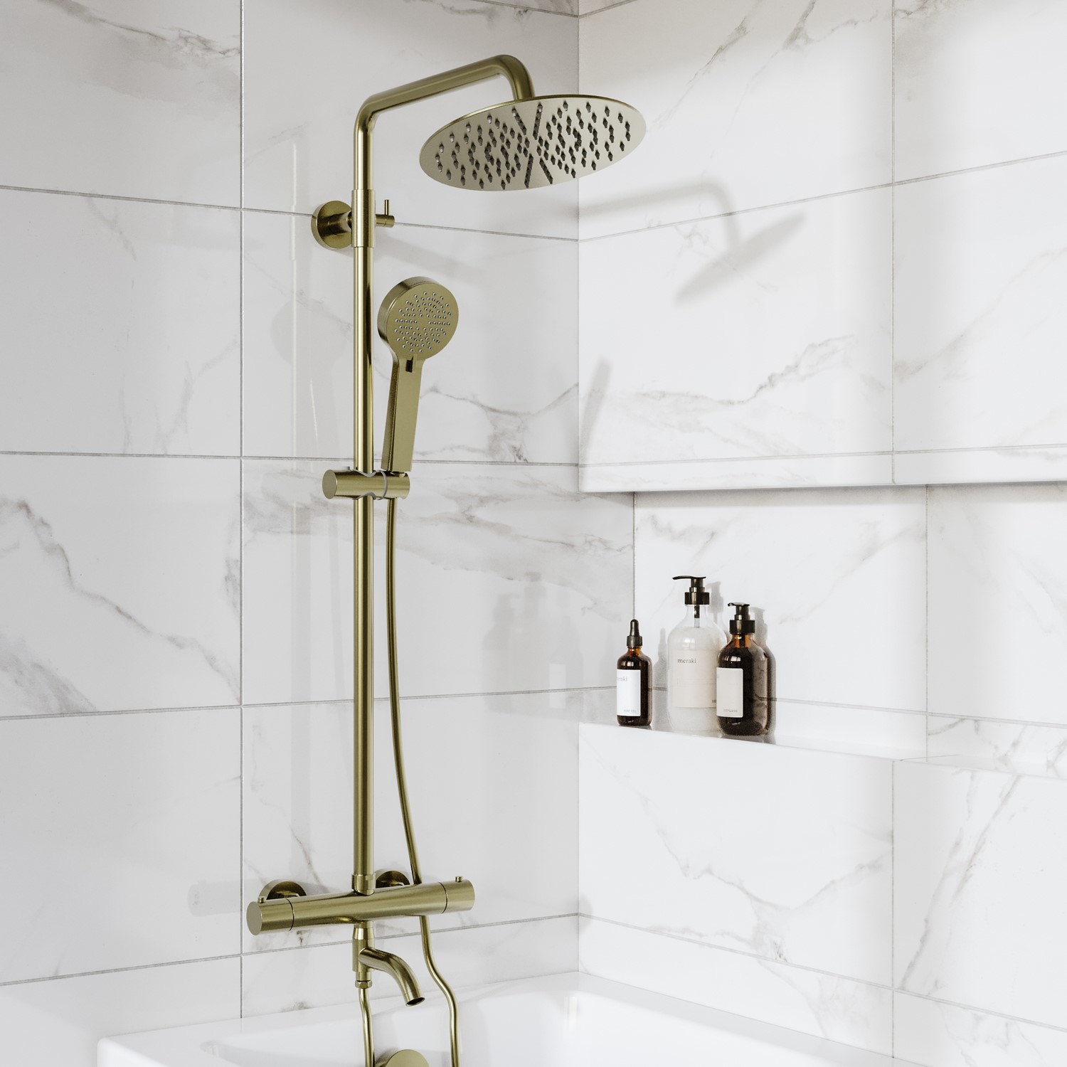 Thermostatic Exposed Shower with 3 Outlets: This wall-mounted system features an exposed thermostatic bar valve that lets you easily control water temperature and switch between the overhead shower, hand shower, and bath spout.