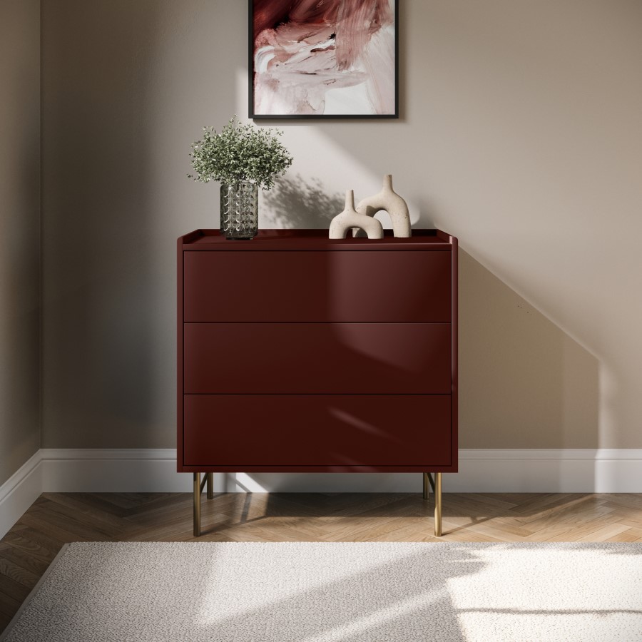 The Zane Chest of 3 Drawers combines sleek, contemporary design with practical functionality, making it a refined bedroom dresser. Its minimalist, handle-free form features six spacious push-to-open drawers on smooth metal runners, perfect for storing clothes, bedding, and everyday essentials. A subtle border around the top keeps surface items secure, while the warm burgundy matt finish and contrasting brushed-gold legs add a touch of understated luxury. Elevated for easy cleaning underneath and crafted from durable materials, the Zane chest of 3 drawers is a stylish, modern, and long-lasting addition to any bedroom.