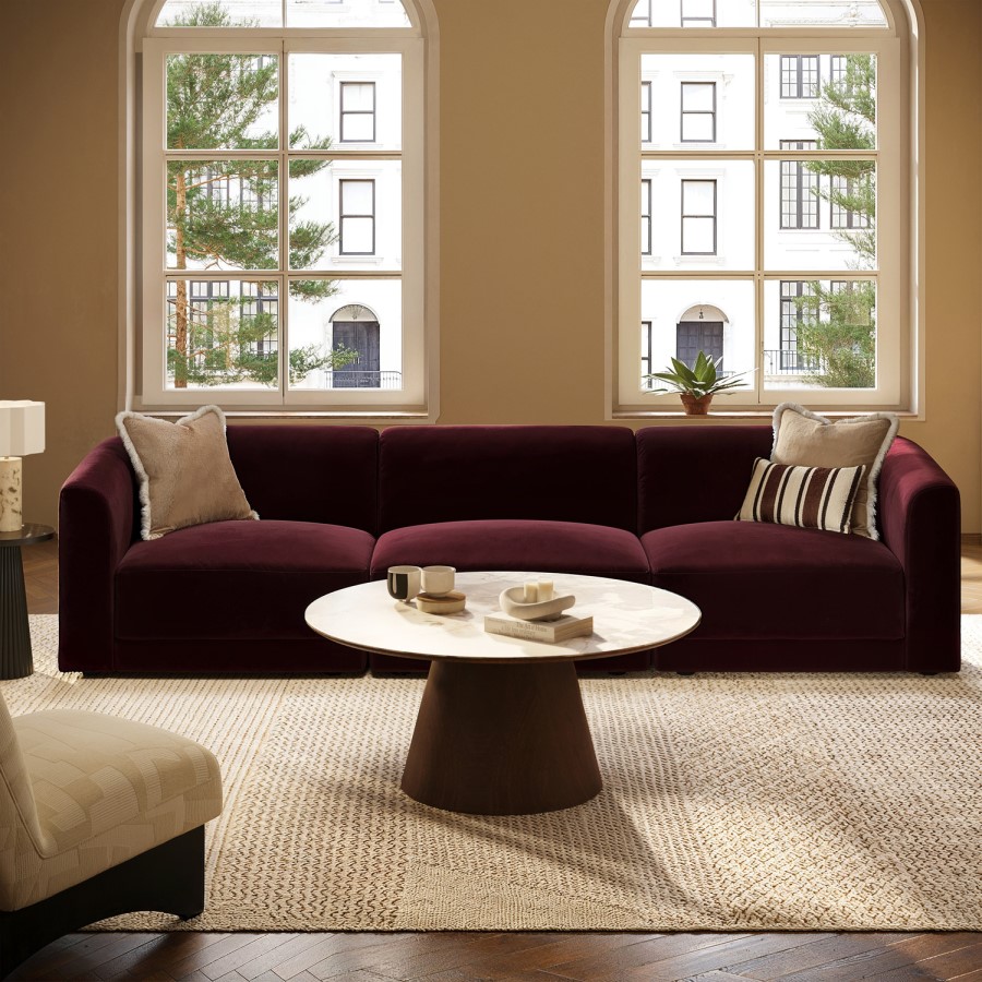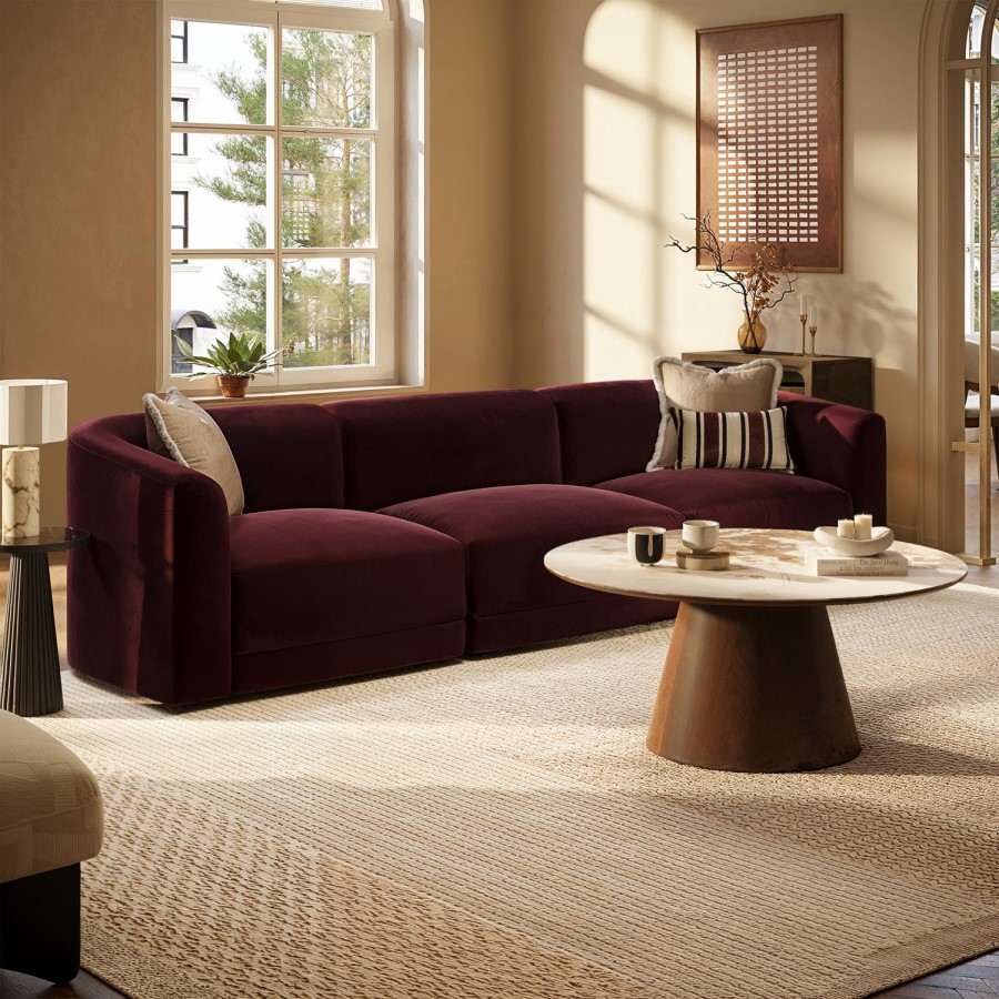 The Laine 4-Seater Modular Sofa combines modern design with gentle curves and a bold, rounded silhouette. Upholstered in soft, durable burgundy velvet, it adds a warm, inviting splash of colour to any living space. Designed as a family sofa, it features deep seats, a low-profile modular form, and foam with pocket springs for superior comfort and support. Spacious, stylish, and versatile, this sofa is the perfect place to unwind.