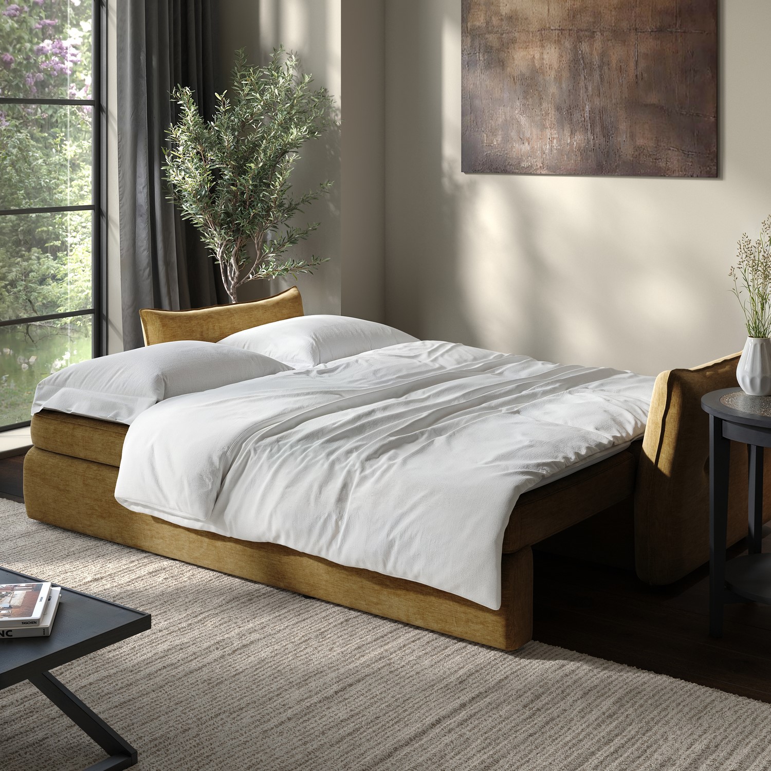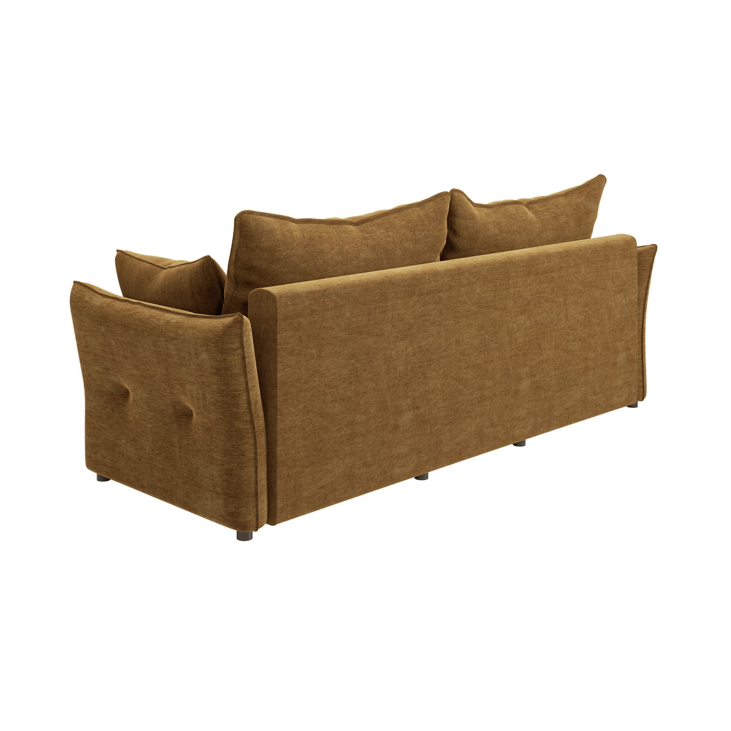 Be prepared for overnight guests with the Gaia Futon Sofa Bed in a stunning golden brown chenille fabric. Easily transform the 3-seater sofa into a bed with the simple and smooth pull-out mechanism. This fold-out sofa bed is complete with a built-in memory foam mattress top, creating a comfortable double bed for your guests, ensuring a great nights sleep. This sofa bed features a textured chenille fabric with a caramel brown hue that instantly adds warmth to your space. The durable chenille fabric is perfect for busy households, requiring little maintenance to keep it looking its best. Under the seats you'll find a hidden storage compartment, perfect for storing your bedding and any other essentials. For additional comfort and support, this sofa bed is foam and fiber-filled and comes with 2 matching throw cushions.