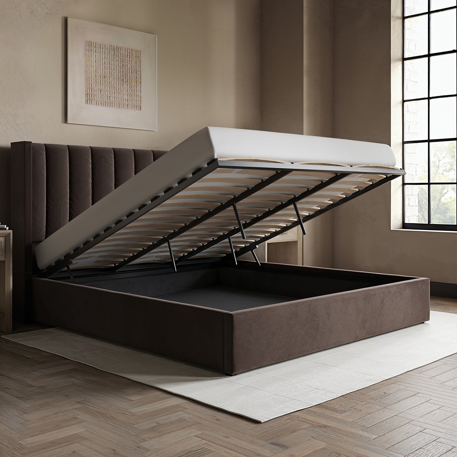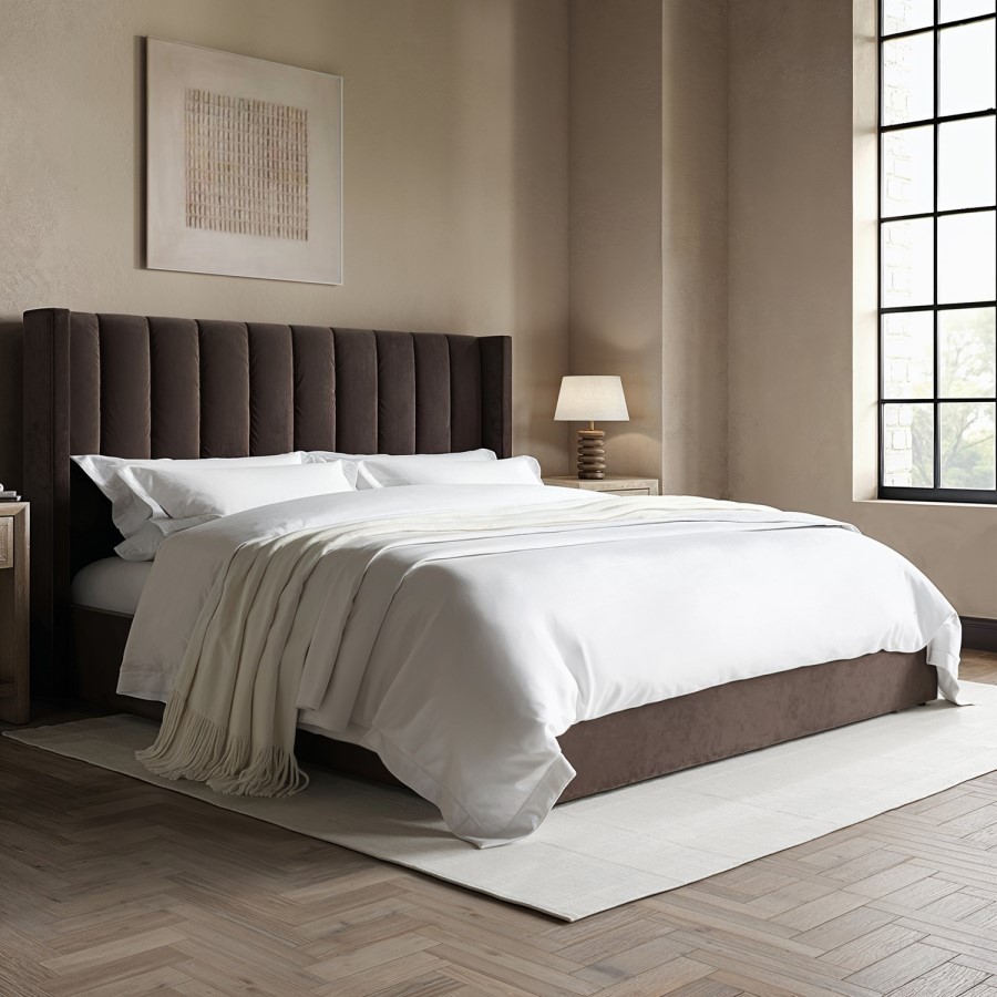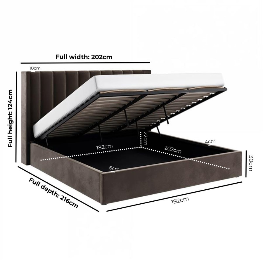 The stunning Maddox Ottoman bed has it all; style, comfort and storage. Upholstered in a luxurious chocolate brown velvet fabric, it is easy to coordinate with other furniture pieces and fits perfectly into any modern bedroom scheme. The padded winged headboard is sumptuously cushioned. The end-opening gas-lift mechanism allows you to access the generous storage space with ease, and the compartment features a fabric-lined base to protect your items from dust and wear. The bed features a durable wooden frame, with a sturdy wooden sprung-slatted base, which is supported by central legs for extra stability. This bed fits a UK standard super king mattress which is not included, giving you the freedom to pair it with a mattress of your choice.