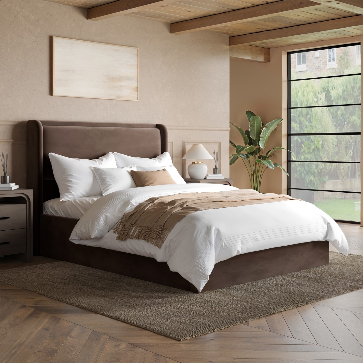 Plush, Pillow-Style Winged Headboard: The plush, pillow-style winged headboard adds a touch of modern elegance and luxury to your bedroom.