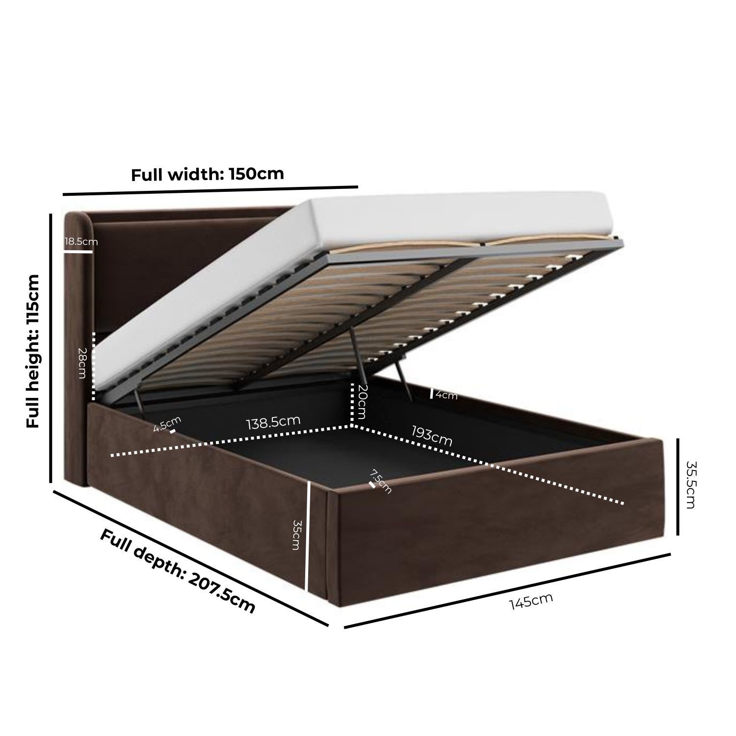 The Frida Ottoman Bed blends modern functionality with timeless style. Upholstered in a rich chocolate brown velvet, its plush, pillow-style winged headboard creates a luxurious focal point that invites relaxation, making it the perfect statement piece for any bedroom. The clean lines and gently rounded edges give it a minimalist aesthetic. Designed with spacious storage, the bed has an end-opening gas-lift mechanism for easy access to a spacious, fabric-lined storage compartment. The sprung slatted base provides enhanced mattress support and ventilation. This bed fits a UK standard double mattress.