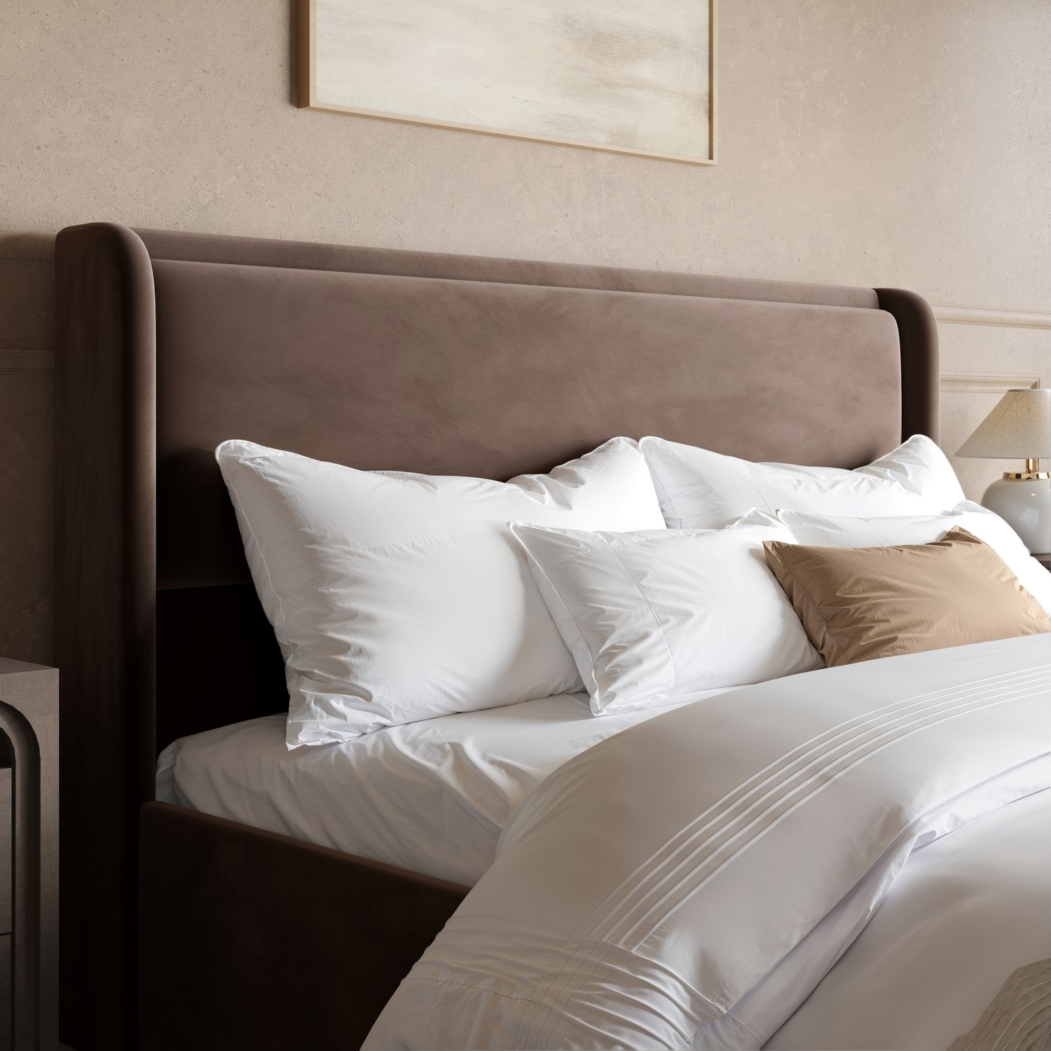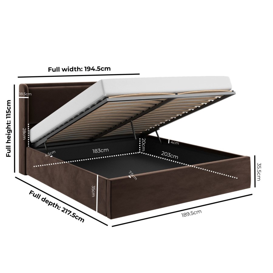 The Frida Ottoman Bed blends modern functionality with timeless style. Upholstered in a rich chocolate brown velvet, its plush, pillow-style winged headboard creates a luxurious focal point that invites relaxation, making it the perfect statement piece for any bedroom. The clean lines and gently rounded edges give it a minimalist aesthetic. Designed with spacious storage, the bed has an end-opening gas-lift mechanism for easy access to a spacious, fabric-lined storage compartment. The sprung slatted base provides enhanced mattress support and ventilation. This bed fits a UK standard super king mattress.