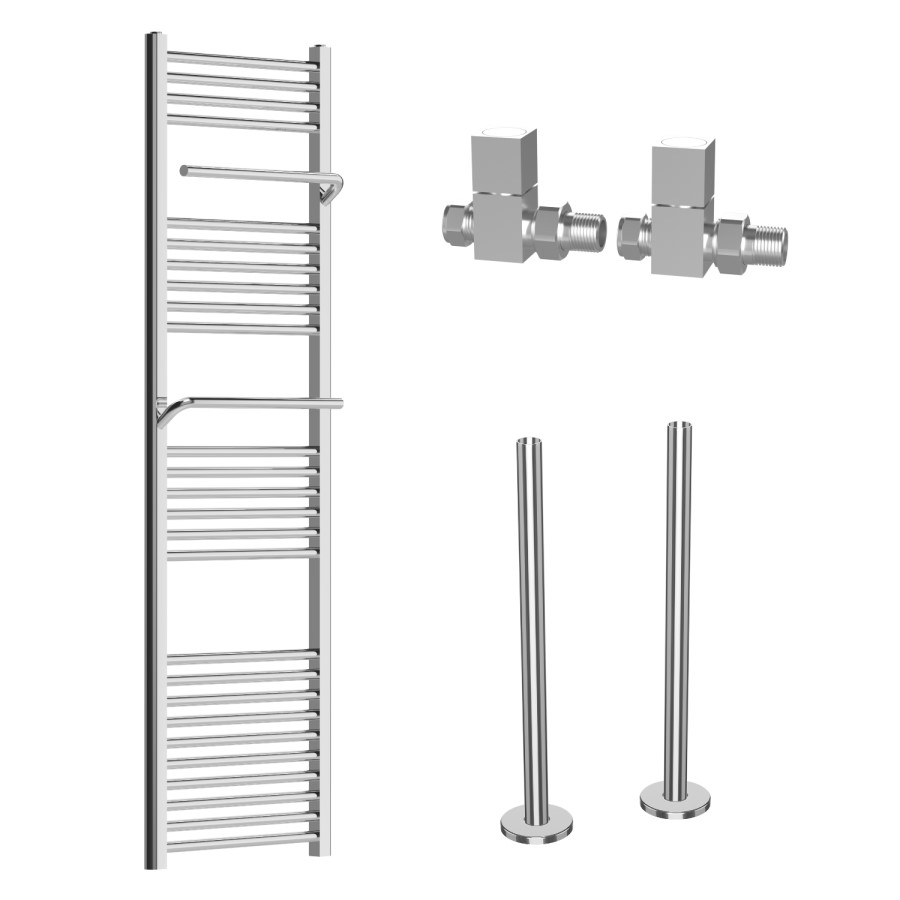 Add style and practicality to your space with this large chrome Nazco vertical heated towel radiator. Its gleaming chrome finish and minimalist vertical alignment make it perfect for any modern bathroom. This tall, wall hung radiator provides impressive heat output through your central heating system, ensuring your towels stay warm and your space feels cosy. This wall-mounted radiator combines stylish appeal with everyday functionality — a smart, space-saving choice for contemporary homes. The towel radiator features 26 rails, plus 2 additional heated towel bars with a depth of 149mm. The bars are designed for hanging and drying two extra towels- perfect for a modern family bathroom. The matching chrome pipe cover kit is perfect for hiding unsightly copper pipes between the floor and your radiator valves. The straight manual radiator valves have a square-head design that brings modern charm to any bathroom.
