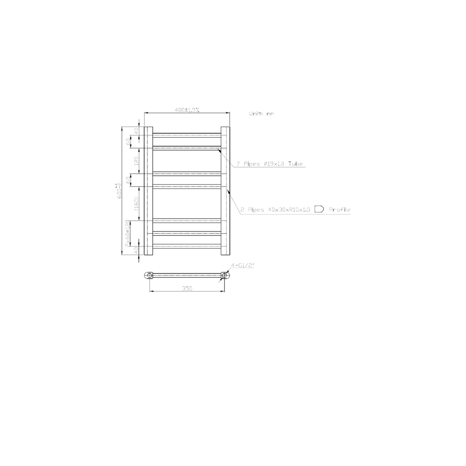 - Radiator Dimensions: H600mm x W400mm x D30mm