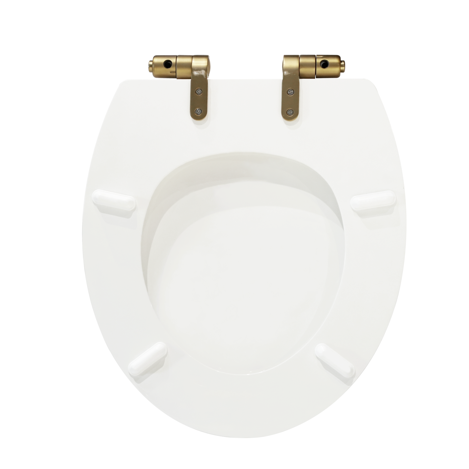 Wooden Toilet Seat With Brushed Brass Hinges: Offering a sturdy, warmer alternative to plastic – ideal for comfort and long-term use. Matching brushed brass soft-close seat hinges for coordinated detailing.