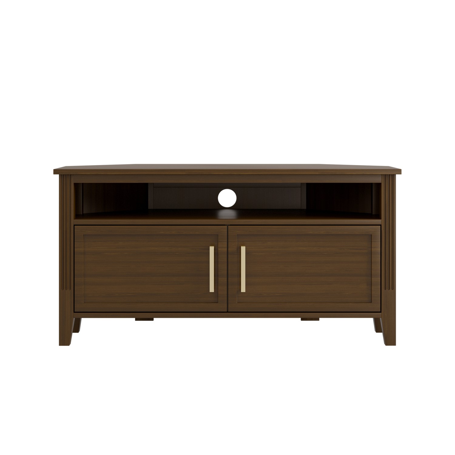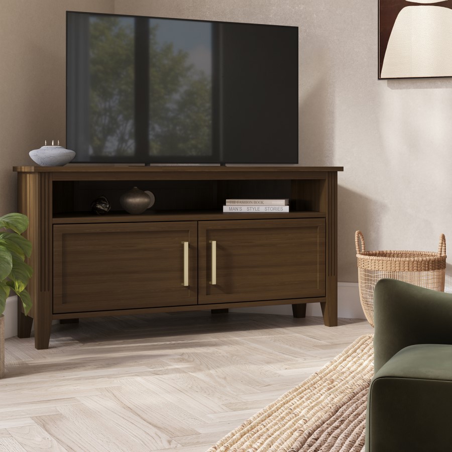 The Delilah Walnut Corner TV Unit blends classic charm with modern sophistication, making it a stylish centrepiece for any living space. Crafted from solid pine in walnut finish, it features elegant fluted side details and refined brass accents that add a subtle touch of luxury. Designed with practicality in mind, the unit offers a combination of cupboards and a shelf to neatly conceal media accessories, remotes and everyday clutter. A built-in cable management hole keeps wires organised and out of sight, while the tapered legs create an elevated look that enhances the your space. Timeless yet contemporary, the Delilah Corner TV Unit is the perfect balance of form and function for modern living rooms.