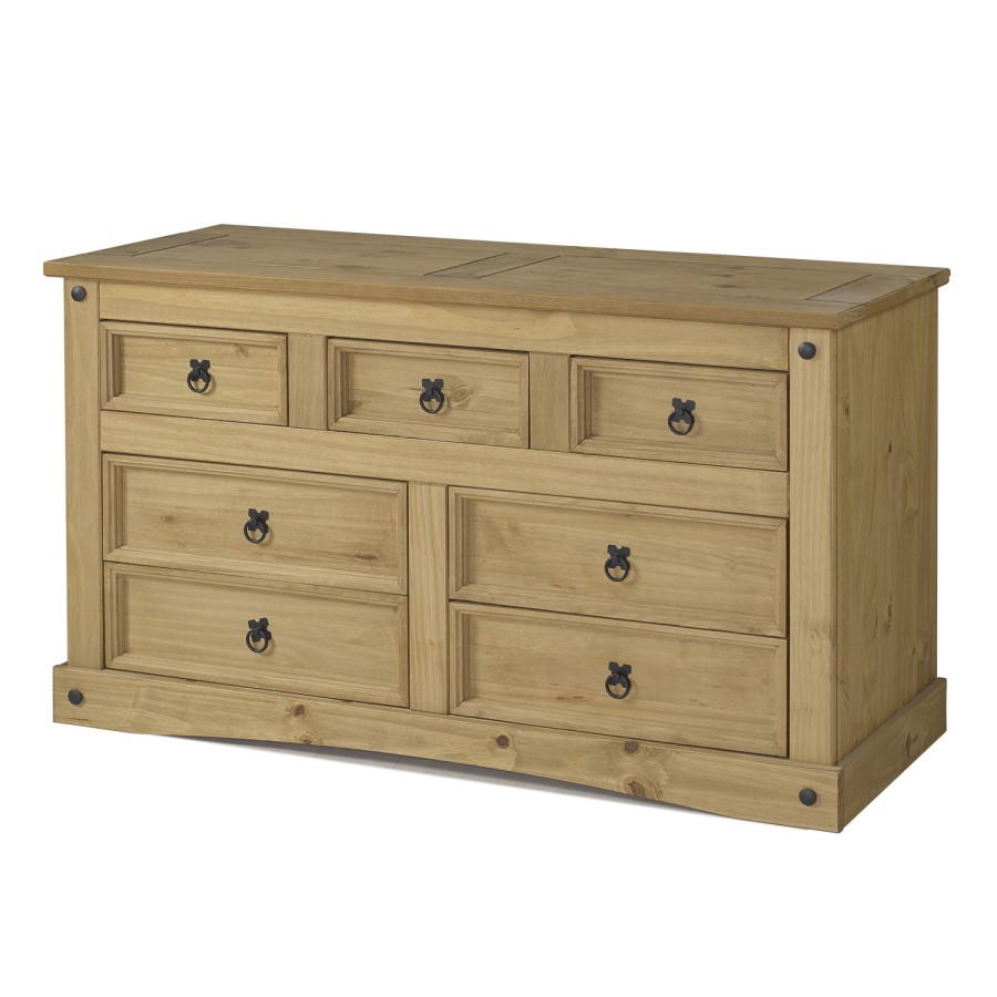 This wide Corona chest houses seven drawers in total, plenty to get organised. The lower bottom drawers come in ideal for folded items whilst the top three are smaller making them perfect for socks, undergarments, delicate items or to simply hide away some clutter. The spacious surface top is perfect for a bedroom TV or to use as dresser space.