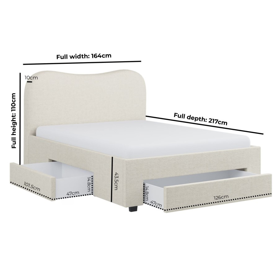 Elevate your bedroom with the Joanie bed, where modern design effortlessly blends style, function, and comfort in a sleek frame. It features a statement curved headboard that adds soft, eye-catching appeal and is upholstered in soft chenille fabric with a modern, textured finish. The neutral cream tone complements a wide range of bedroom decors, while the two built-in drawers, fitted with smooth castor wheels, provide discreet underbed storage for bedding, clothing, or everyday essentials, with effortless access and easy movement. It has sprung slatted base that ensures enhanced mattress support and comfort for a restful night’s sleep. This bed fits a UK standard king-size mattress, which is not included, allowing you the freedom to pair it with a mattress of your choice.