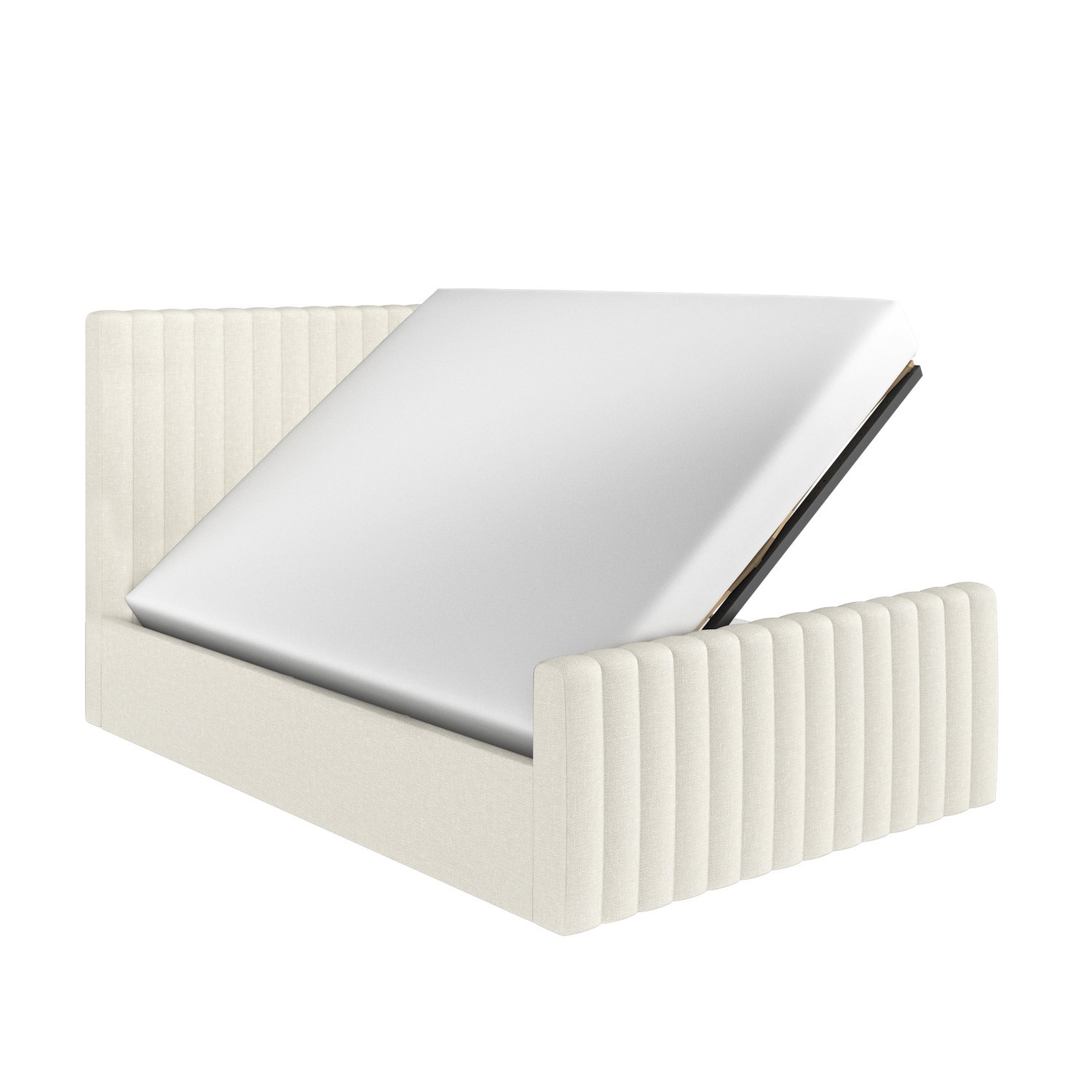 The Khloe Ottoman Bed is an opulent focal point for any bedroom, perfect for adding a touch of luxury while offering practical hidden storage. Upholstered in a soft, durable cream woven fabric, it fits seamlessly into any modern bedroom design. The side-opening gas-lift mechanism allows you to access the generous fabric-lined storage space effortlessly. You can also set the storage frame to open on either the right or left-hand side, allowing extra freedom with your bedroom layout. It features a sprung slatted base for comfortable mattress support, ensuring a great night's sleep. This bed fits a UK standard double-size mattress, which is not included, giving you the freedom to pair it with a mattress of your choice.