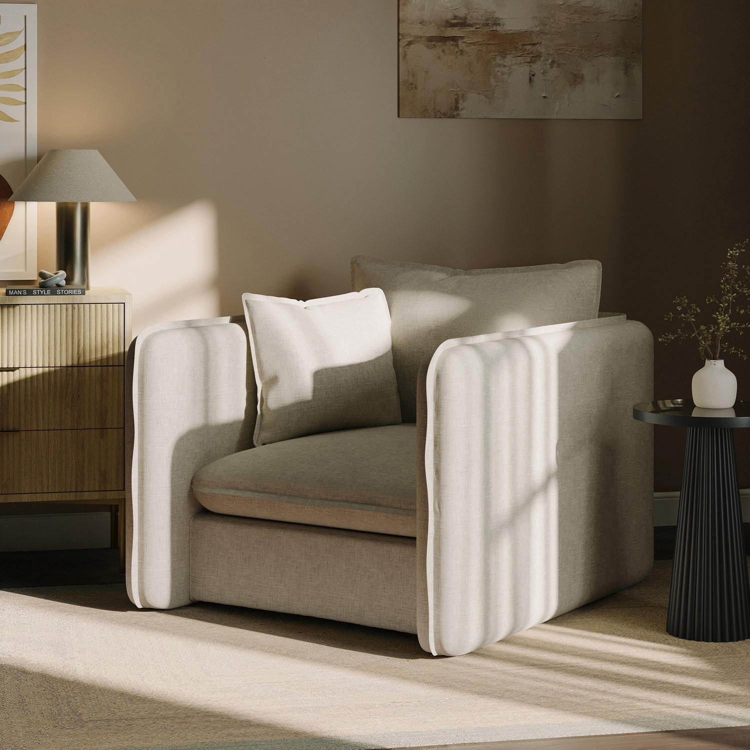 Understated elegance: Relax in comfort and style with the Lorelai Armchair. Upholstered in a breathable cotton blend with a linen-effect texture, it brings a calm, contemporary vibe to any room.