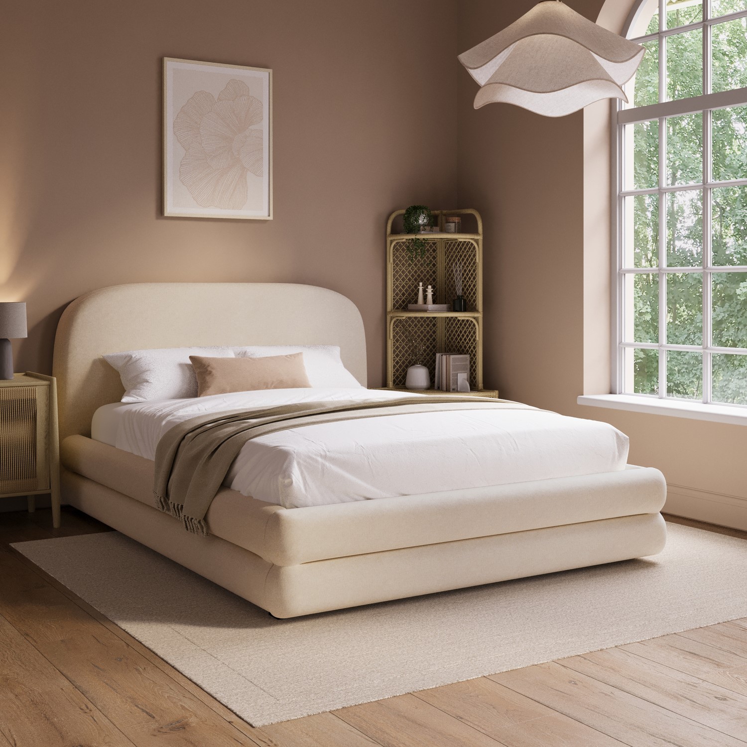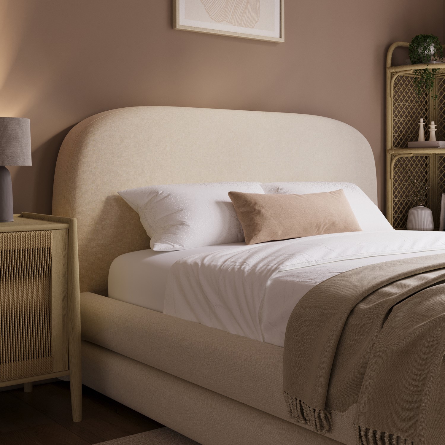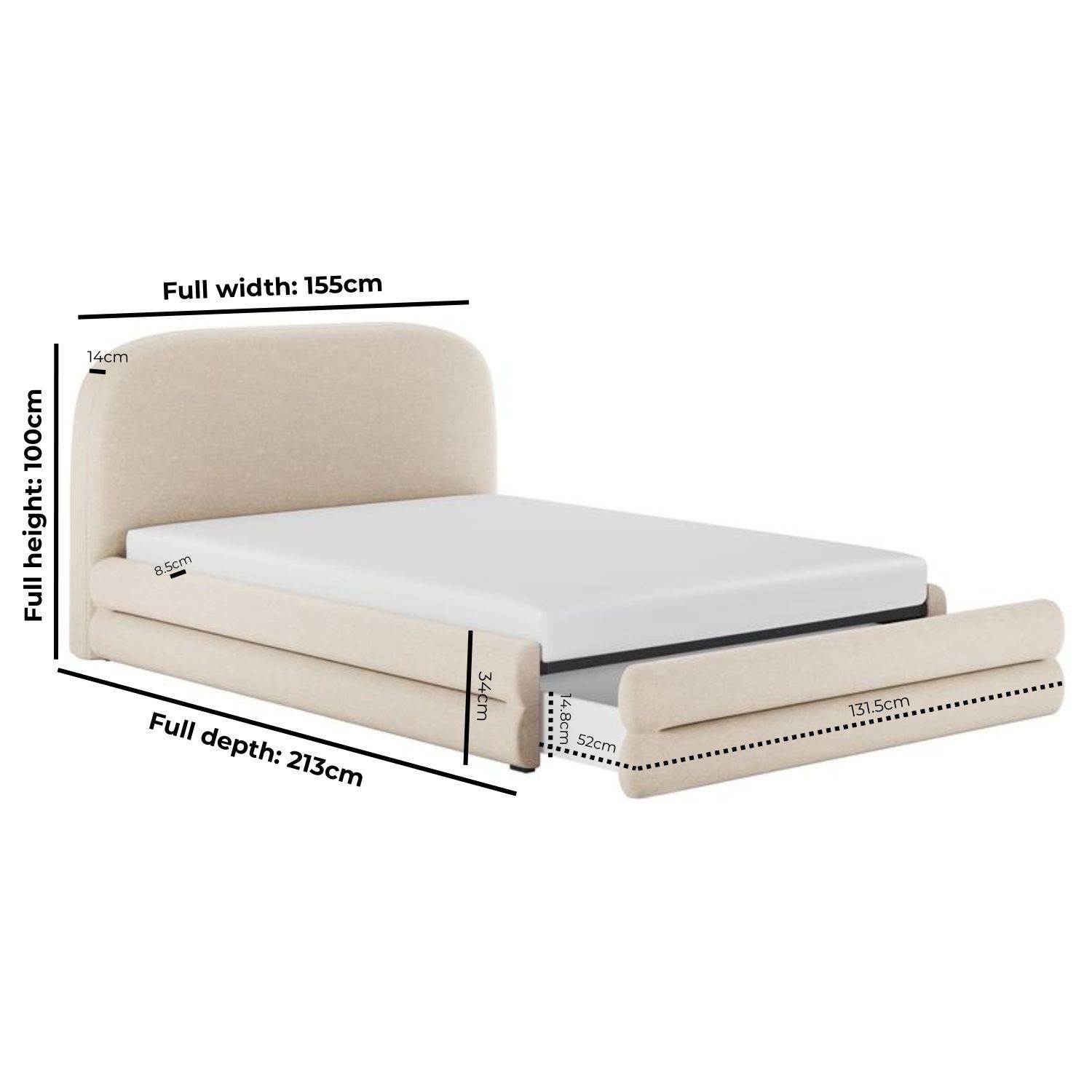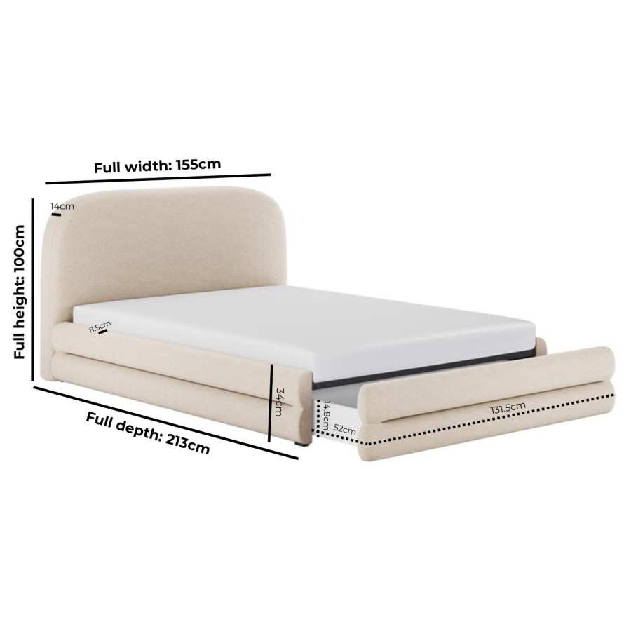 Elevate your bedroom with the Connie Bed Frame, where modern curves meet plush comfort. Its padded, curved frame and soft cream chenille upholstery create a warm, inviting focal point. The chunky double-layered base frame offers bold, lasting stability, while the sprung slatted base enhances support and airflow for restful sleep. A spacious pull-out drawer at the foot of the bed, fitted with smooth castor wheels, provides discreet, effortless storage. Designed to fit a UK standard double-size mattress (not included), it offers the flexibility to pair it with a mattress of your choice.