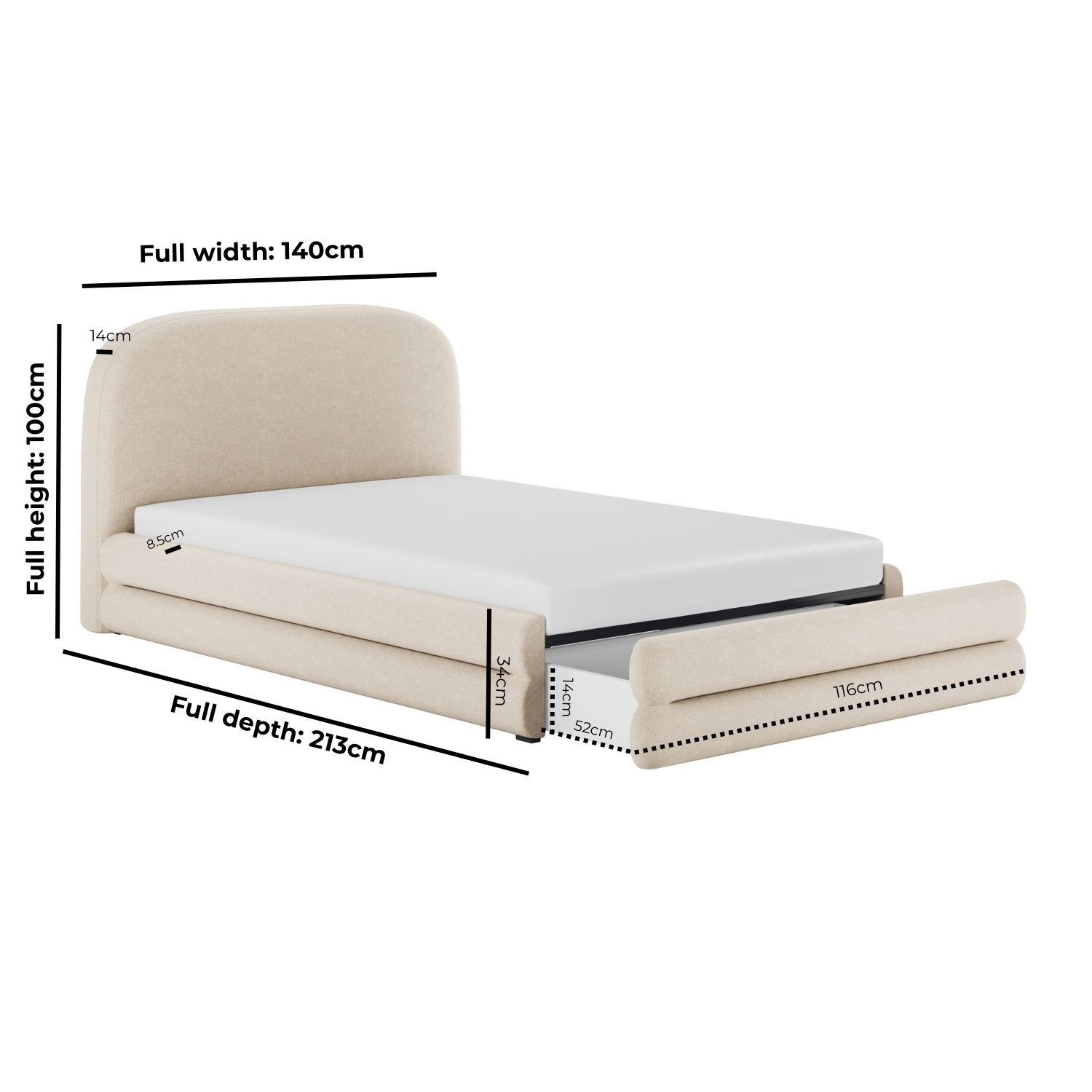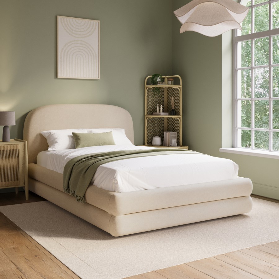 Elevate your bedroom with the Connie Bed Frame, where modern curves meet plush comfort. Its padded, curved frame and soft cream chenille upholstery create a warm, inviting focal point. The chunky double-layered base frame offers bold, lasting stability, while the sprung slatted base enhances support and airflow for restful sleep. A spacious pull-out drawer at the foot of the bed, fitted with smooth castor wheels, provides discreet, effortless storage. Designed to fit a UK standard small double-size mattress (not included), it offers the flexibility to pair it with a mattress of your choice.