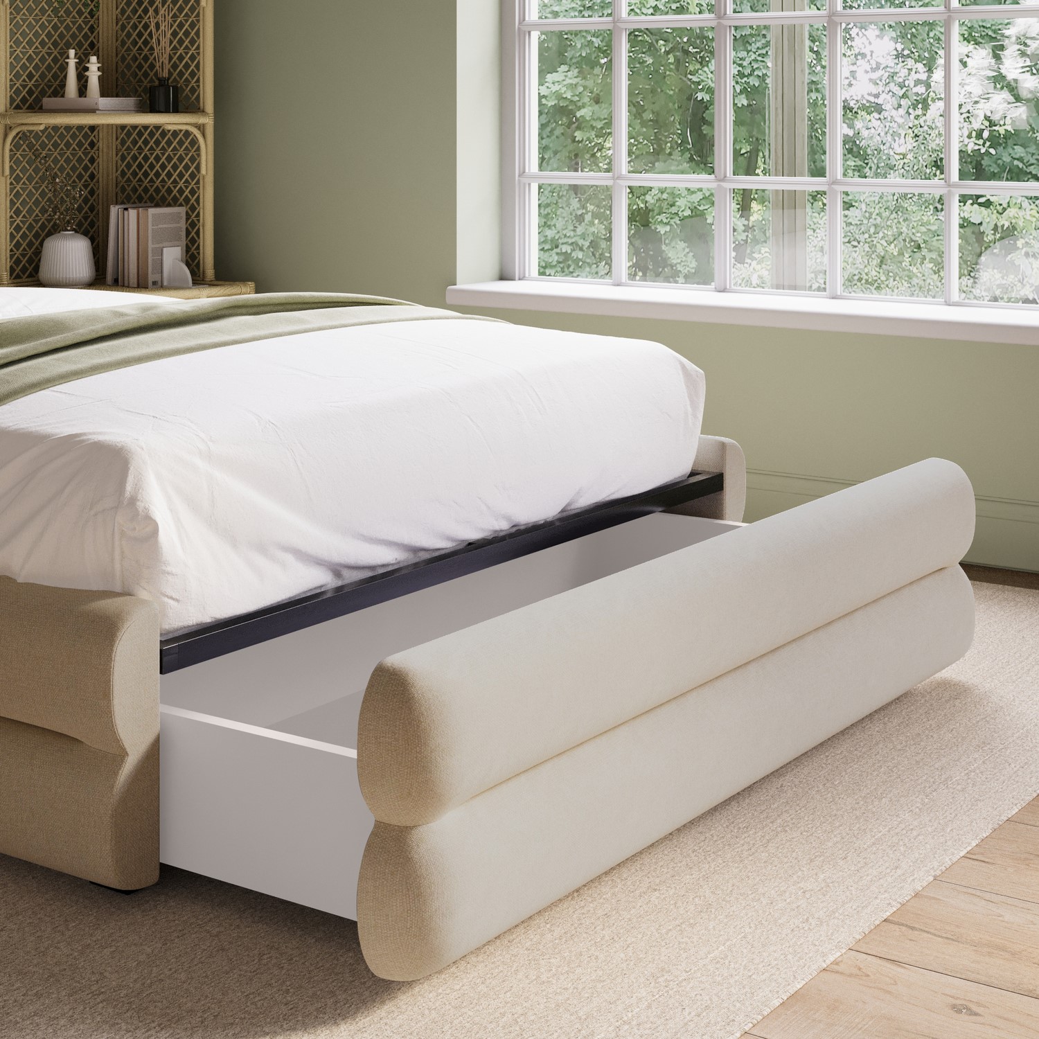 Pull-Out End-of-Bed Drawer: Includes a spacious drawer at the foot of the bed for discreet storage, fitted with smooth castor wheels for effortless access.