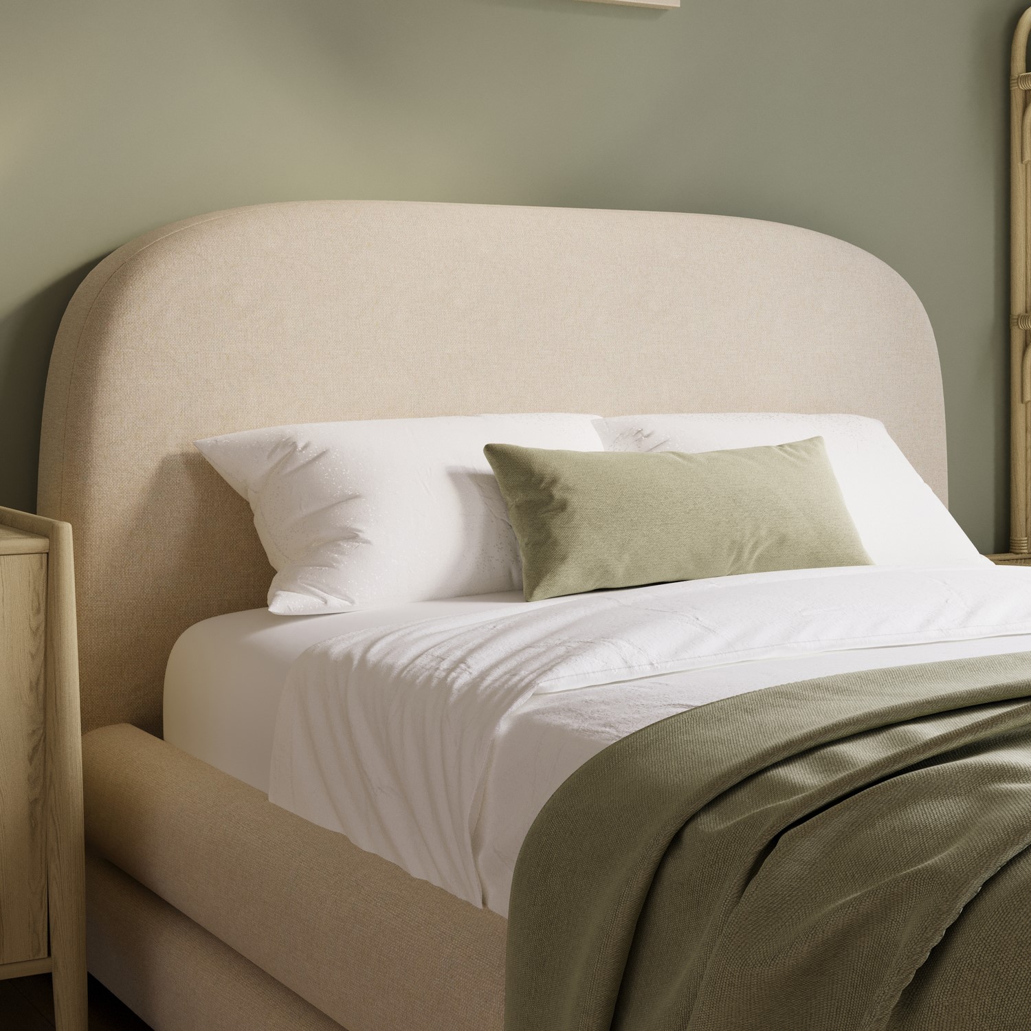 Modern Curved Silhouette: A stylish bed with a padded curved frame and a luxurious chenille headboard, creating a plush, inviting focal point.