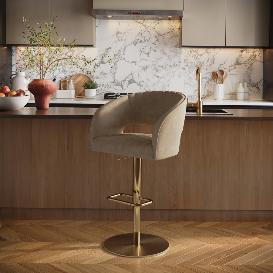 Bring elevated style to your kitchen or dining space with the Runa bar stool in beige faux leather. Its smooth, wipe-clean seat is shaped for comfort and paired with vertical stitching for added detail. The curved backrest hugs your frame while the padded seat makes every perch a pleasure. A brushed gold base and footrest add a luxe finish, while the gas-lift and swivel functions make it a practical pick for everyday living. With its slim pedestal base and neutral palette, this stool is the perfect balance of sophistication and simplicity.