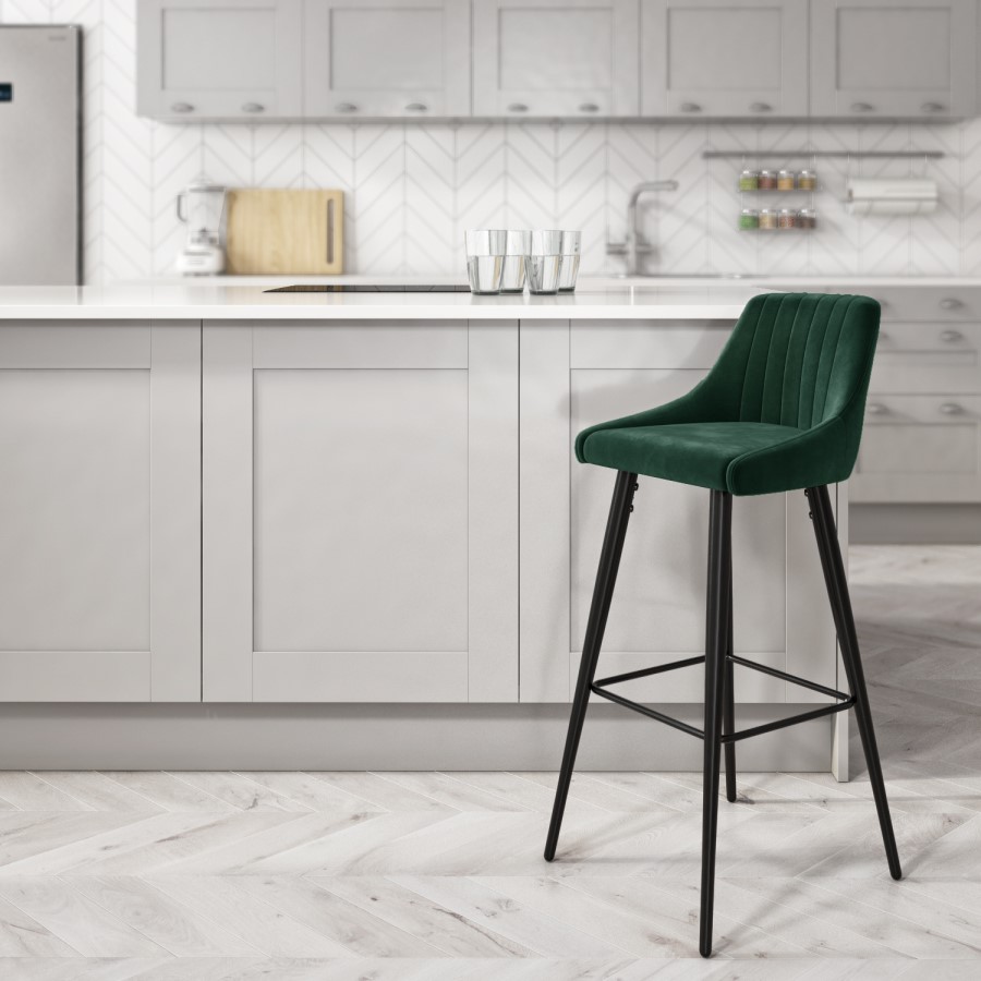 Covered in luxuriously soft velvet and finished with tapered black legs, these modern bar stools are a great addition to any kitchen. The foam padded seat and pleated backrest create the ideal place to relax with a drink or enjoy your breakfast. At 77cm high these chairs are the perfect height for your kitchen island or home bar set up.