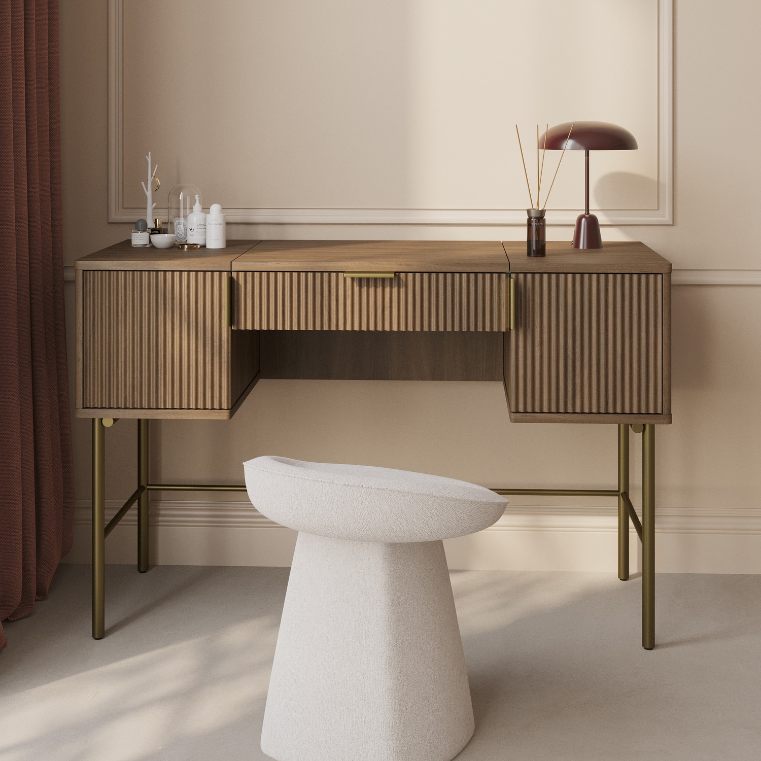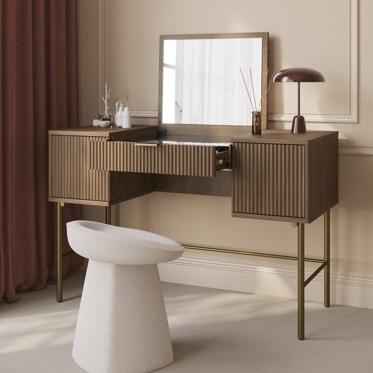 The Valencia Dressing Table combines modern design with practical functionality. Its dark oak finish brings warmth and depth to your space, while stunning ribbed door fronts and a hidden fold-out mirror add style and convenience. Featuring cupbaords and a large drawer with smooth metal runners and compartments, keeping essentials neatly organised. The glass-topped surface provides visibility and doubles as a work or study space. Finished with elegant gold handles and legs, this vanity table is a perfect addition to any bedroom or dressing room.