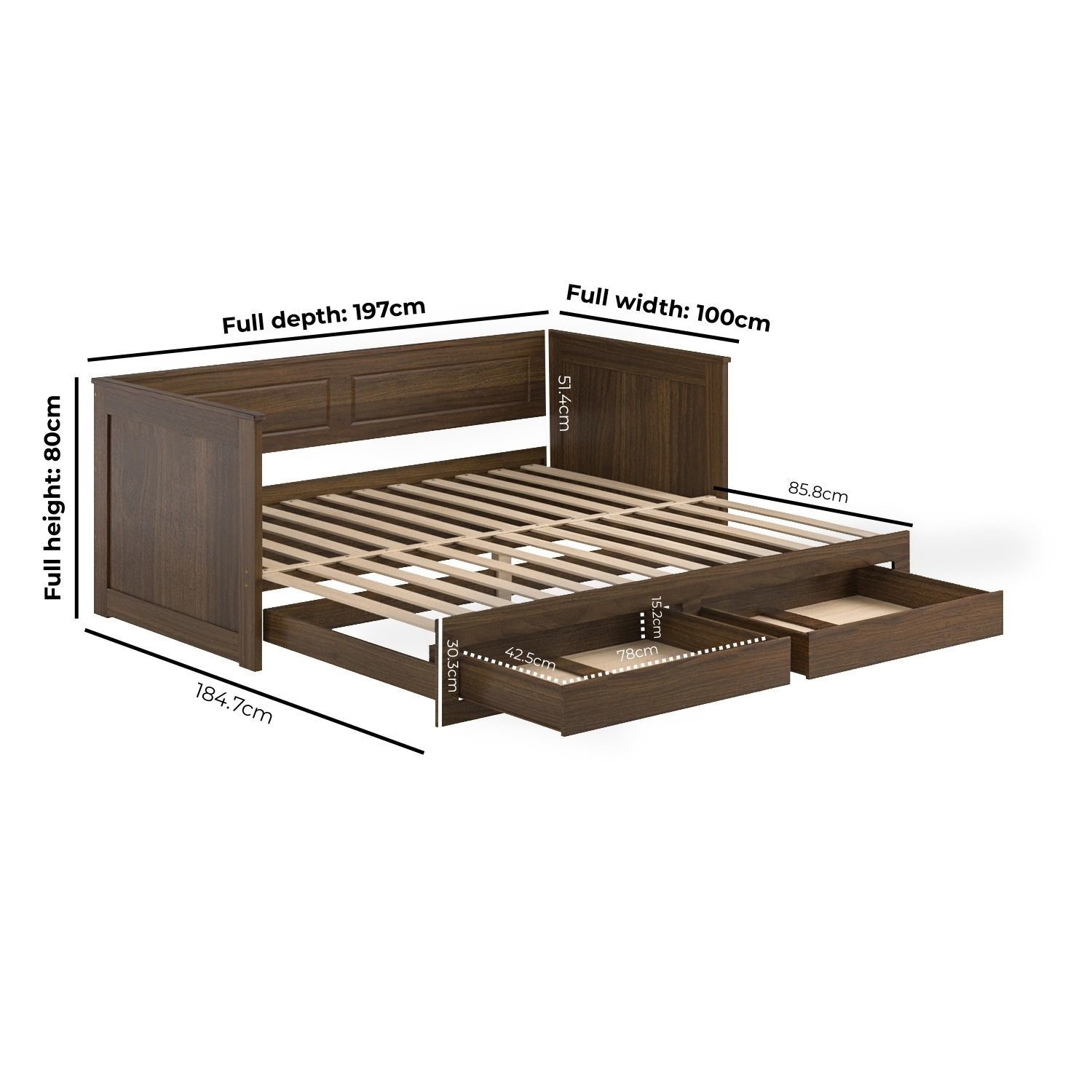 Elevate your living space and add a touch of sophistication to your home with this beautifully designed daybed, blending style with functionality. Finished in a rich walnut-stained tone, its timeless design effortlessly complements both modern and traditional interiors. Use it as a modern sofa during the day and a spacious bed at night. It converts from a single to a double bed thanks to the easy-access trundle bed, which seamlessly fits within the bed frame. Once it's pulled out, it can accommodate multiple guests. Both beds have wooden slatted bases and fit two standard single mattresses that aren't included. We recommend pairing this bed with two VSLEEPFULMEM3FT Sleepful Single Memory Foam Mattresses for optimum comfort and a tidy fit.