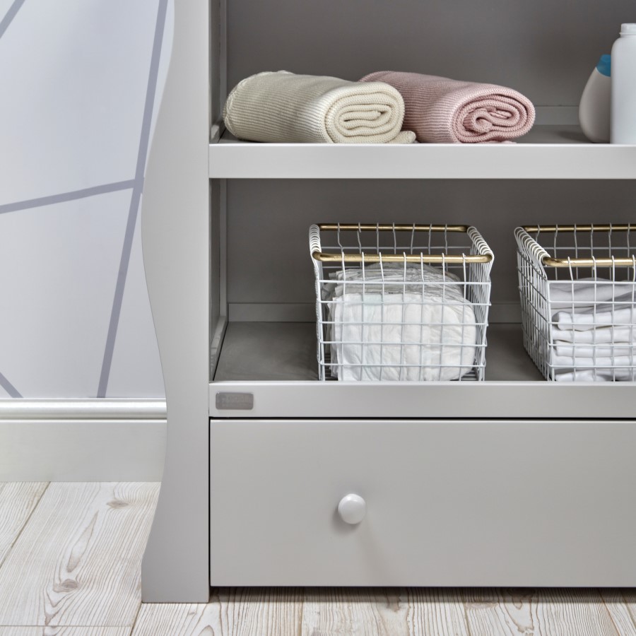 The Nebraska changing table is a traditional design with elegant curved details. With 2 spacious storage areas and 1 full width drawer, there is plenty of room to store your little ones clothes or nursery essentials. The integral changing area securely fits a standard changing mat.