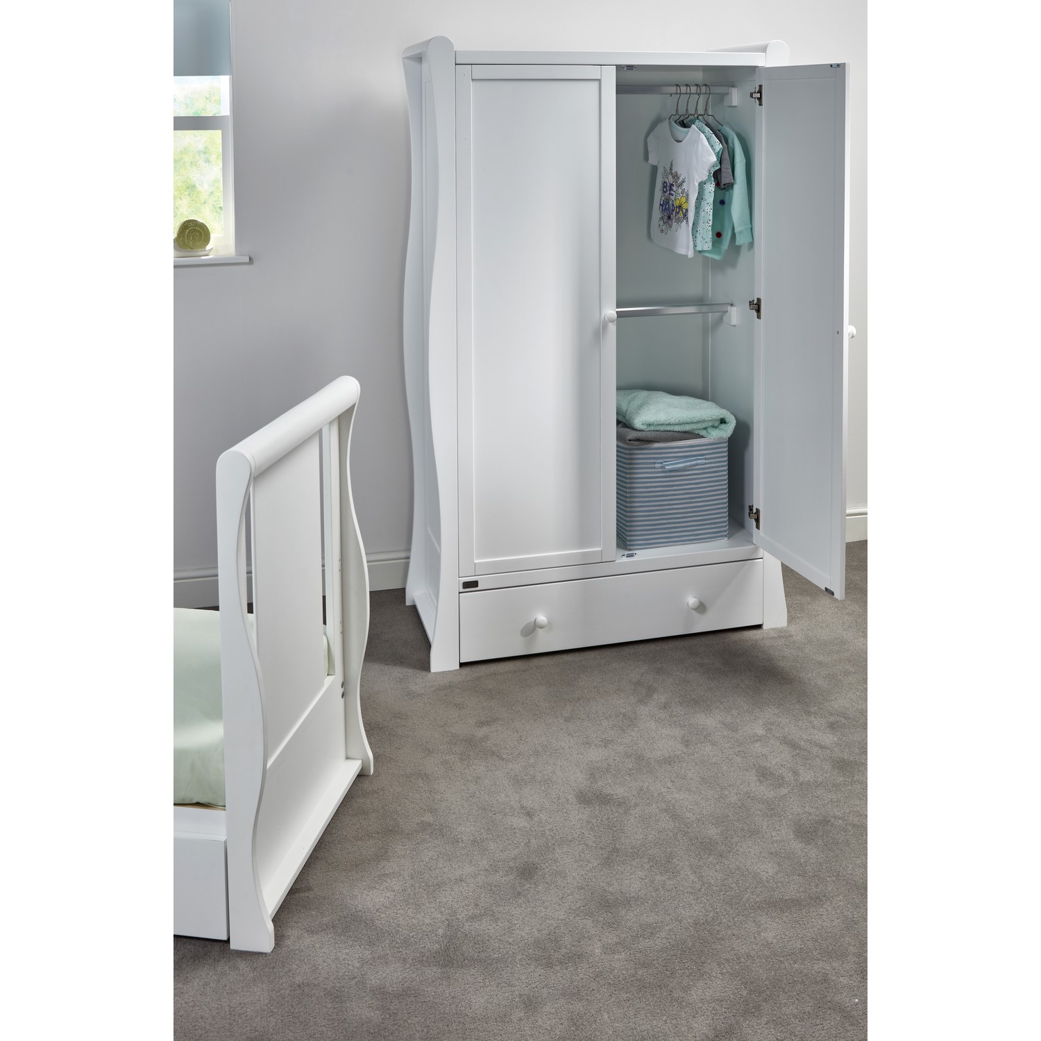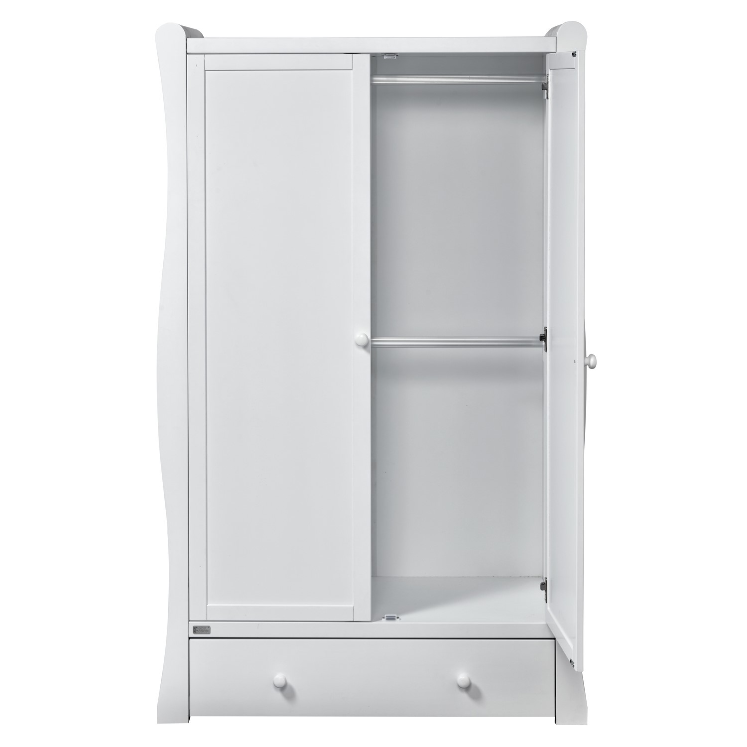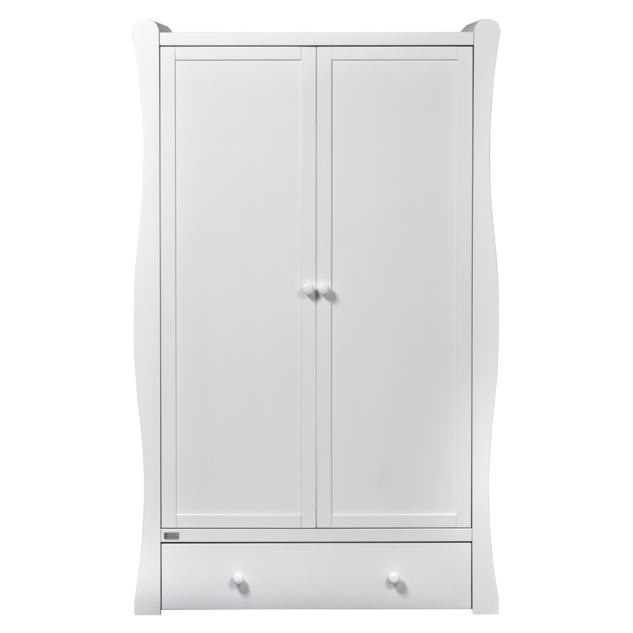 The Nebraska White Double Wardrobe with Drawer is an elegant addition to your nursery with its delicate curved edges. The wardrobe includes 2 full width hanging rails and a spacious, full-width bottom drawer, providing ultimate storage.