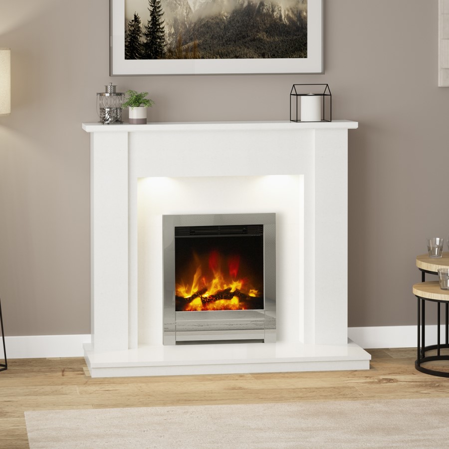 The Flare By Be Modern 48’’ Elda white electric fire with under mantle lights has a stunning polished marble finish. The fireplace is suitable for gas and electric insets with a standard cut out in the back panel to keep wires out of sight. Its design is perfect for a minimalistic aesthetic which is easy to style in any interior.