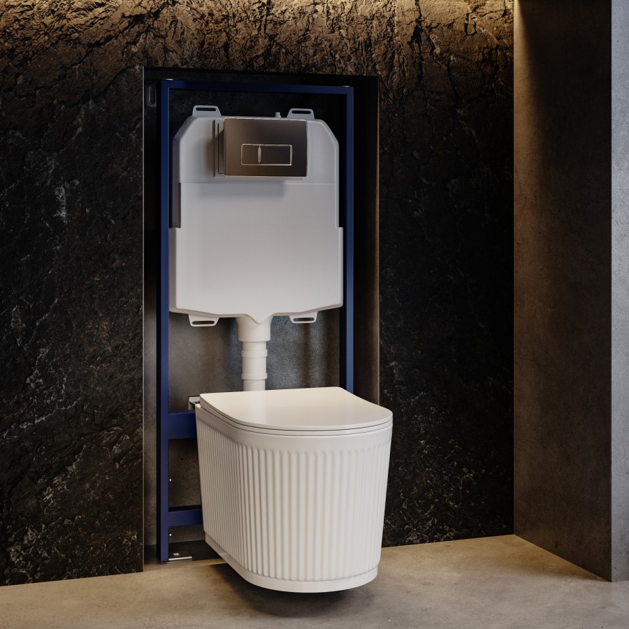 The package also includes a wall-mounted frame with a cistern, a strong and durable tank shell, and a pneumatic chrome flush plate for seamless installation. The 1168mm frame ensures a secure, space-saving solution, ideal for modern bathrooms.