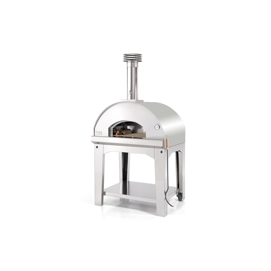 The Fontana Stainless Steel Mangiafuoco pizza oven is a beautifully designed high quality and high performance wood fired oven with a large 60×80 cm cooking chamber and manufactured almost entirely from 304 grade stainless steel. The Mangiafuoco comes equipped with an “easy move” sturdy stainless steel cart with a convenient storage shelf, wheels and hook to hang tools. This easy transportable cart version of the Mangiafuoco Pizza Oven allows you to make convivial moments even more enjoyable on trips out of town, camping or simply to move to the sunniest part of the garden! With wheels and pull out handles, this pizza oven is easy to move. The Mangiafuoco also comes with wood-holder plate, fire tool, 304 grade stainless steel flue pipe with adjustable smoke exit valve & chimney top and a cooking chamber door.