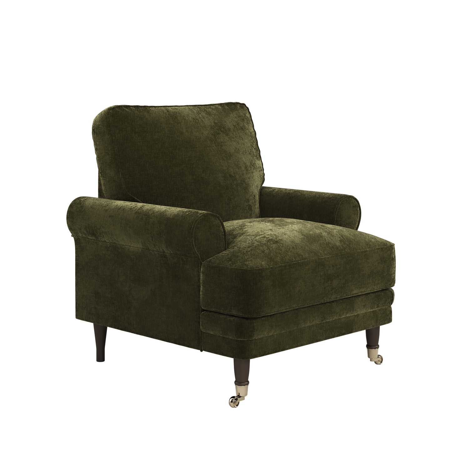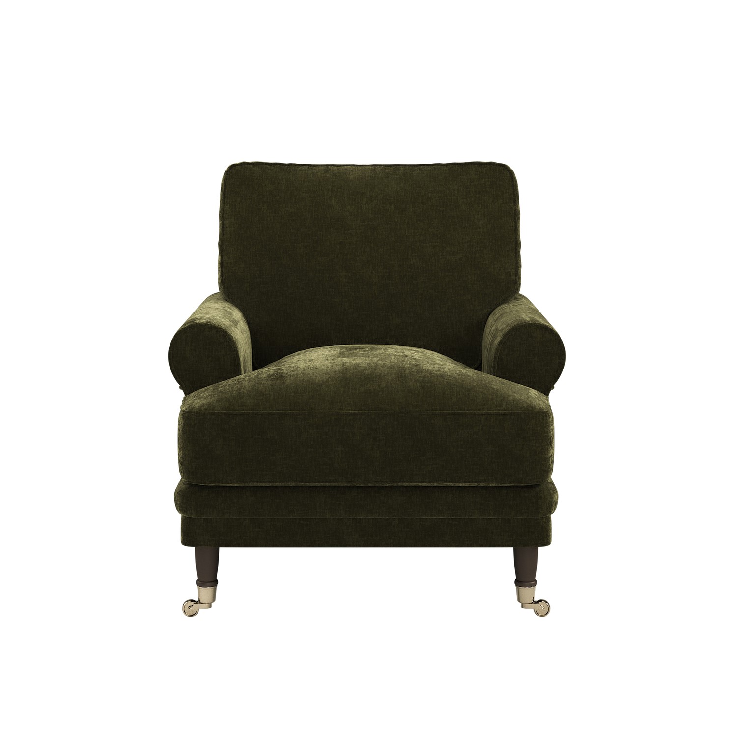 Wooden legs with castors to the front meet a tiered border, creating a refined foundation that enhances the armchair's classic character and charm.