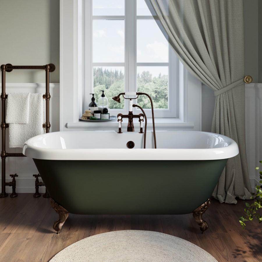 Create a grand statement with this traditional freestanding bath, combining classic elegance with modern functionality. Roll-topped and double-ended, it features smooth, curved edges for a luxurious and relaxing bathing experience at either end. The rich green finish enhances its timeless appeal, while the beautifully ornate brushed bronze ball and claw feet add a striking contrast, making it a true centrepiece in any bathroom.