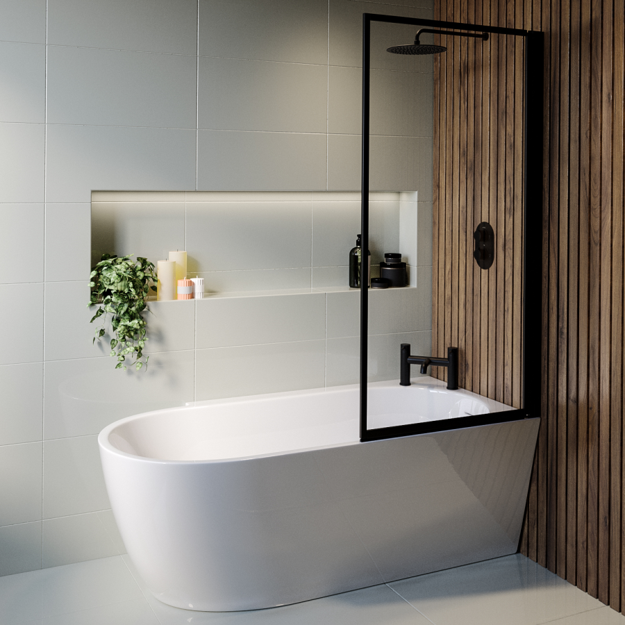 - Comes with a black 6mm hinged bath screen with towel rail