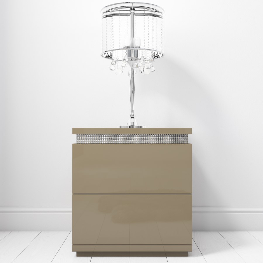 If you like a modern look and love a touch of glamour then the Gabriella range is just perfect for you. Sitting upon a stainless steel plinth this Gabriella bedside table exudes contemporary elegance. The clean, linear design is finished superbly with a sleek mink high gloss coating, giving a natural shine to the piece. The luxurious design of this bedside table is sure to modernise your space. Its crowning glory is a unique diamante trim, neatly positioned around the table top, adding an elegant touch of sparkle to this otherwise clean cut piece of furniture.