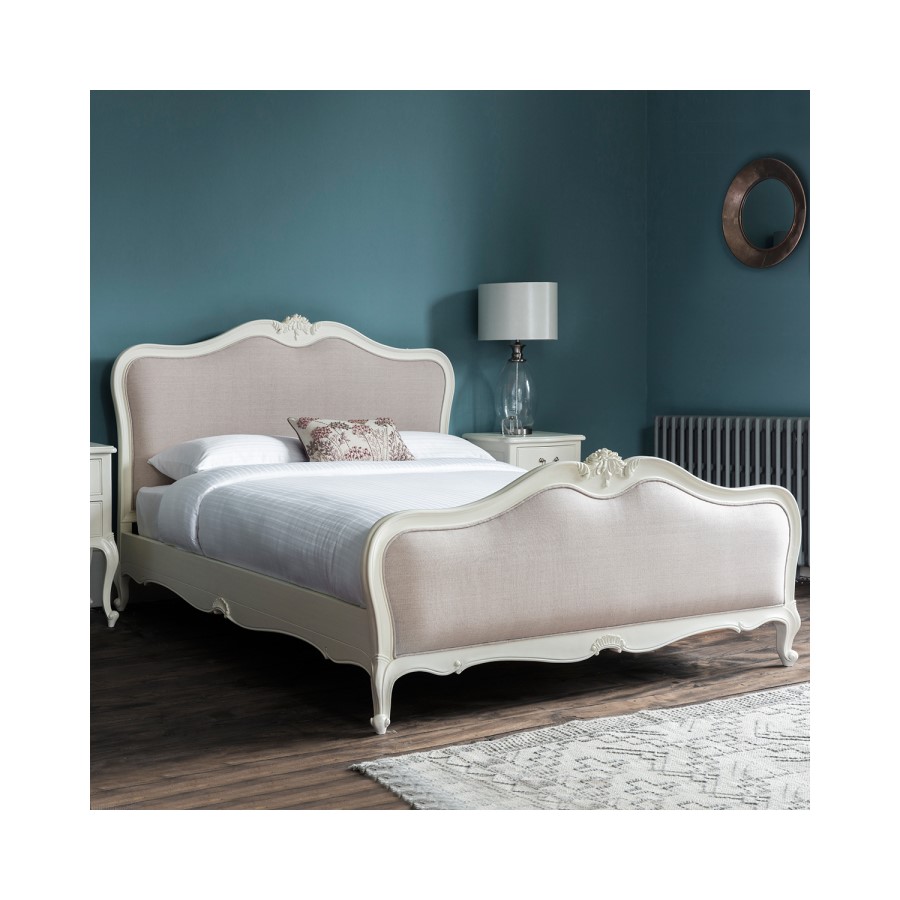 The Chic bedstead is an elegant piece featuring in subtle grey coloured linen upholstery on its head and footboard. Crafted from mahogany with a painted vanilla finish.