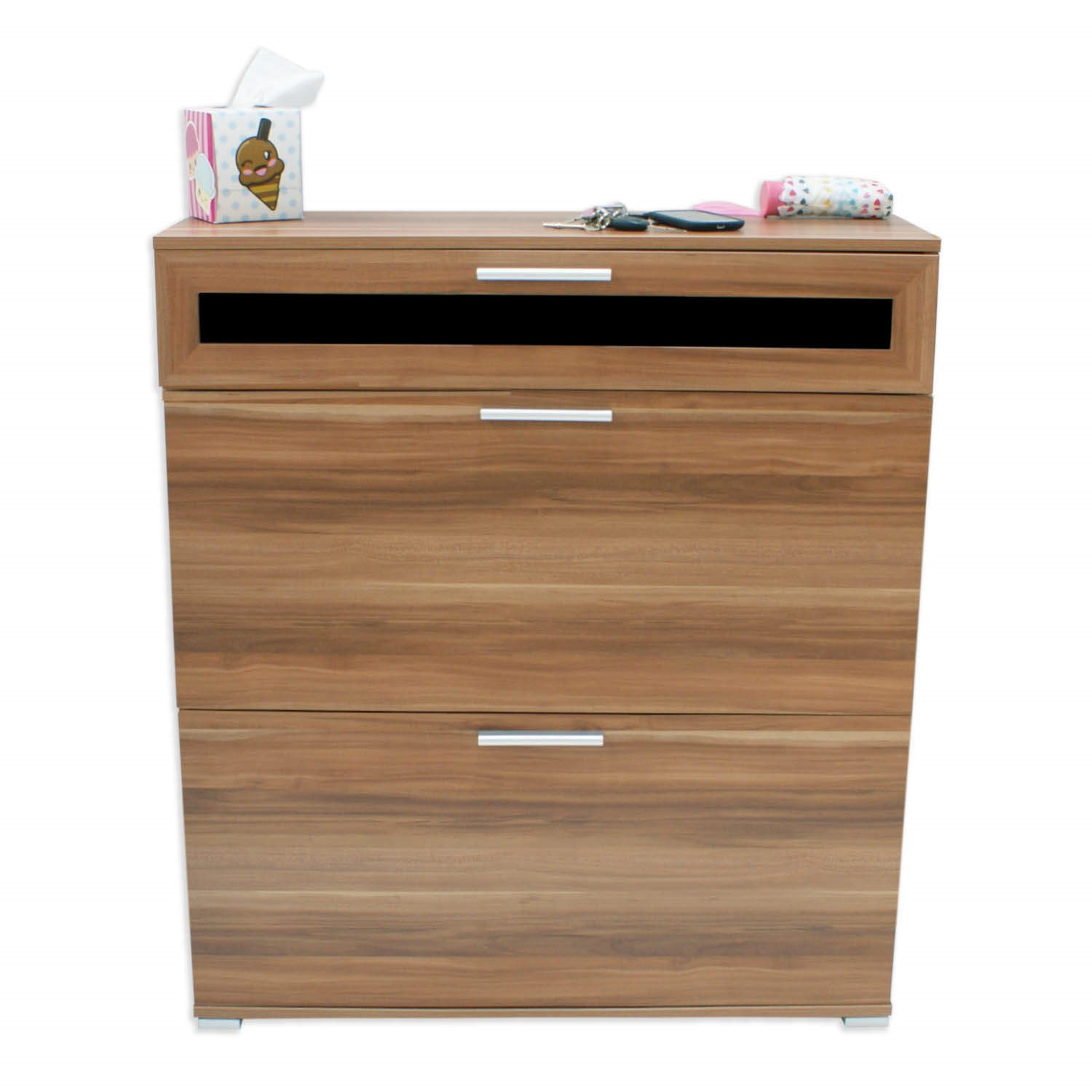 Crafted from MDF the Alaska shoe cabinet is strong and sturdy. Finished with a walnut foil effect, giving the shoe cabinet a high quality, soft to the touch surface. Complete with metal drawer runners and handles.
